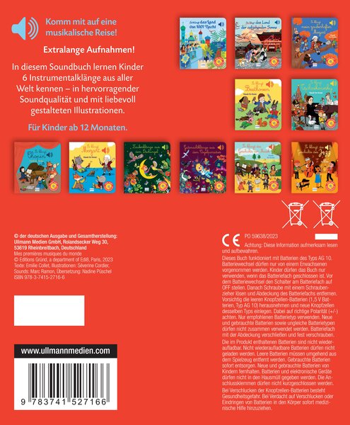Komm mit auf eine musikalische Reise!Mit diesem Soundbuch lernen Kinder Instrumentalklänge aus aller Welt kennen - in hervorragender Soundqualität und mit liebevoll gestalteten Illustrationen.-Soundbuch mit Instrumentalmusik aus aller Welt für Kinder ab 1 Jahr-Interaktives Bilderbuch mit 6 Sounds in hervorragender Klangqualität-Eine musikalische Reise mit den schönsten Klängen aus Afrika, Asien und Nord- und Lateinamerika