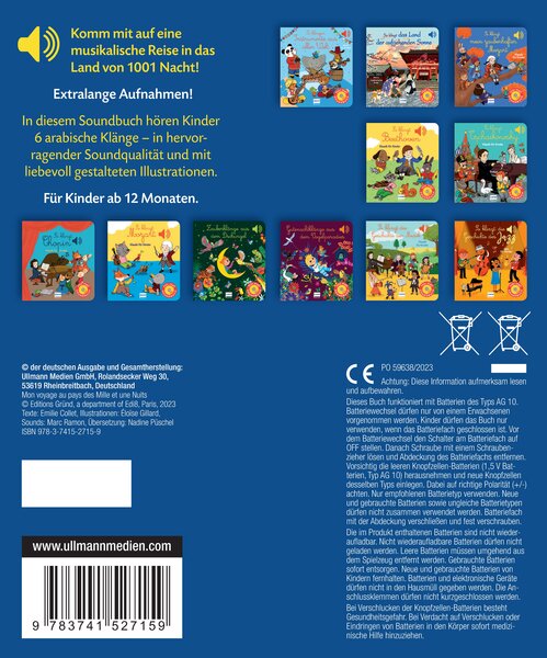 Komm mit auf eine musikalische Reise in das Land von 1001 Nacht!In diesem Soundbuch hören Kinder 6 arabische Klänge - in hervorragender Soundqualität und mit liebevoll gestalteten Illustrationen.-Soundbuch mit traditioneller arabischer Musik für Kinder ab 1 Jahr-Interaktives Bilderbuch mit 6 Sounds in hervorragender Klangqualität-Eine musikalische Reise mit den schönsten orientalischen Klängen