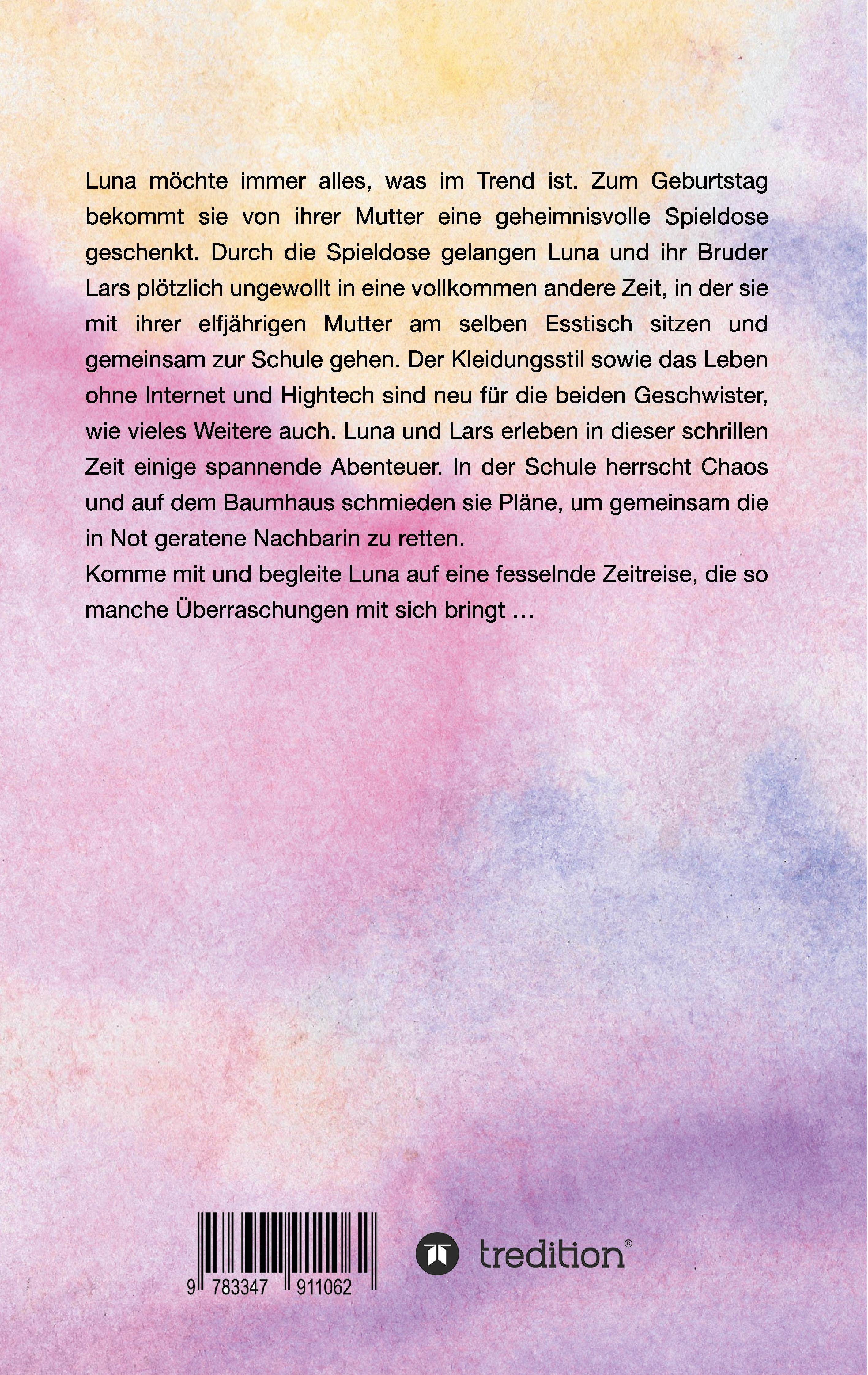 Luna möchte immer alles, was im Trend ist. Zum Geburtstag bekommt sie von ihrer Mutter eine geheimnisvolle Spieldose geschenkt. Durch die Spieldose gelangen Luna und ihr Bruder Lars plötzlich ungewollt in eine vollkommen andere Zeit, in der sie mit ihrer elfjährigen Mutter am selben Esstisch sitzen und gemeinsam zur Schule gehen. Der Kleidungsstil sowie das Leben ohne Internet und Hightech sind neu für die beiden Geschwister, wie vieles Weitere auch. Luna und Lars erleben in dieser schrillen Zeit einige spannende Abenteuer. In der Schule herrscht Chaos und auf dem Baumhaus schmieden sie Pläne, um gemeinsam die in Not geratene Nachbarin zu retten.Komme mit und begleite Luna auf eine fesselnde Zeitreise, die so manche Überraschungen mit sich bringt ...Dieser warmherzige Kinder/Jugendroman vermittelt Nostalgie, Familienzusammenhalt, Freundschaft und Liebe. Es macht Konsumverhalten, Hightech und manche ihrer Wirkungen auf die Kinder zum Thema sowie Mut, für Schwächere einzutreten und Menschlichkeit zu zeigen.