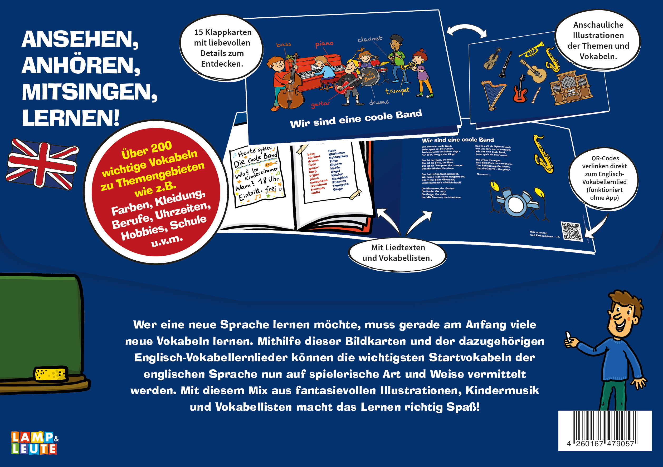 Wer eine neue Sprache lernen möchte, muss gerade am Anfang viele neue Vokabeln lernen. Mithilfe dieser Bildkarten und den dazugehörigen Englisch-Vokabellernliedern können die wichtigsten Startvokabelnder englischen Sprache nun auf spielerische Art und Weise vermittelt werden. Mit diesem Mix aus fantasievollen Illustrationen, Kindermusik und Vokabellisten macht das Lernen richtig Spaß.