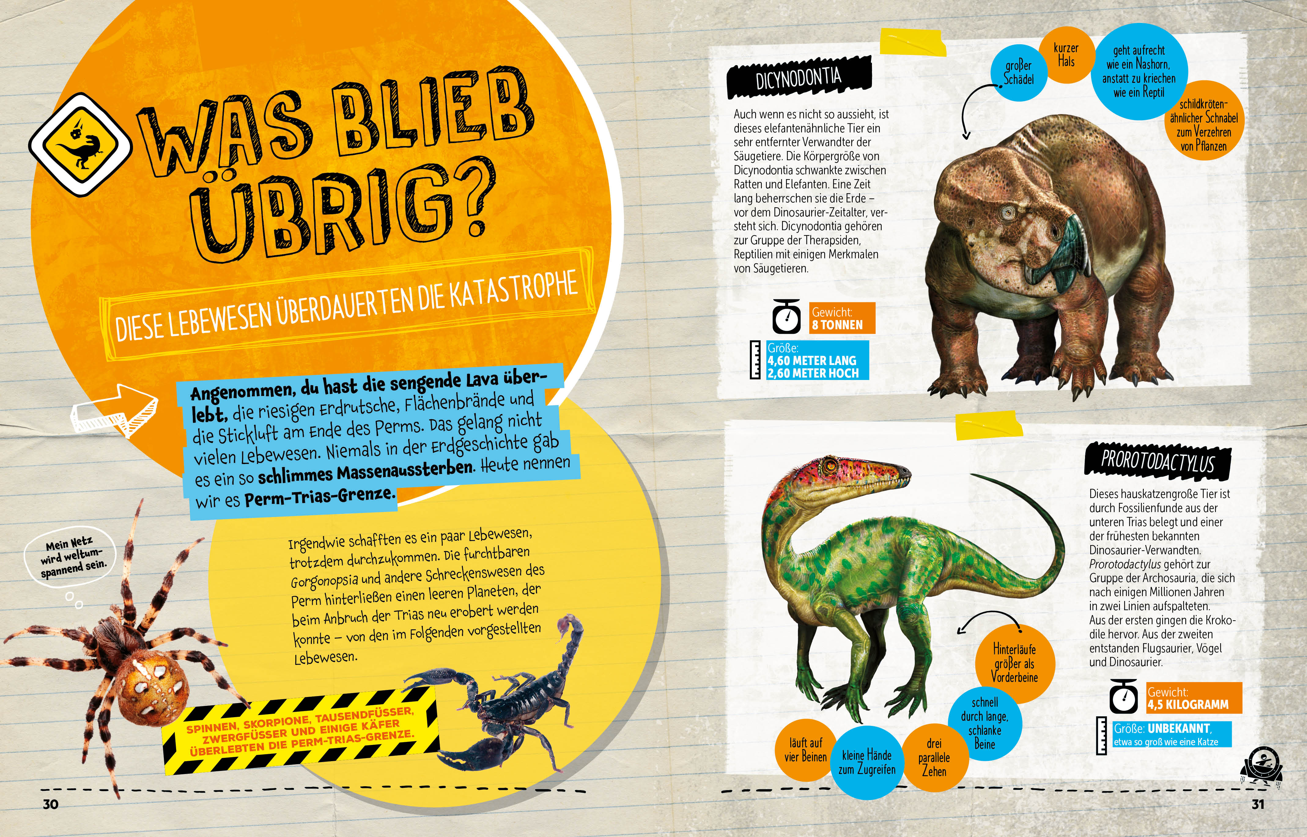 Kein Mensch ist je einem Dinosaurier leibhaftig begegnet! Doch wer würde nicht gerne mal einem echten, lebendigen Dinosaurier gegenüberstehen oder ihn vielleicht doch lieber nur aus sicherer Entfernung beobachten? Was wäre, wenn du dich plötzlich in der Urzeit befändest, Auge in Auge mit Riesenechsen wie T. Rex, Brachiosaurus und Co.? Lass dich auf ein spannendes Gedankenexperiment ein und finde heraus, wie du brenzlige Situationen bei den Dinosauriern gemeistert hättest. Dieser Überlebensleitfaden für das prähistorische Zeitalter hilft dir dabei: Welche Nahrung ist essbar, wo lauern Fressfeinde und wo geht man bei einem Vulkanausbruch in Deckung?
