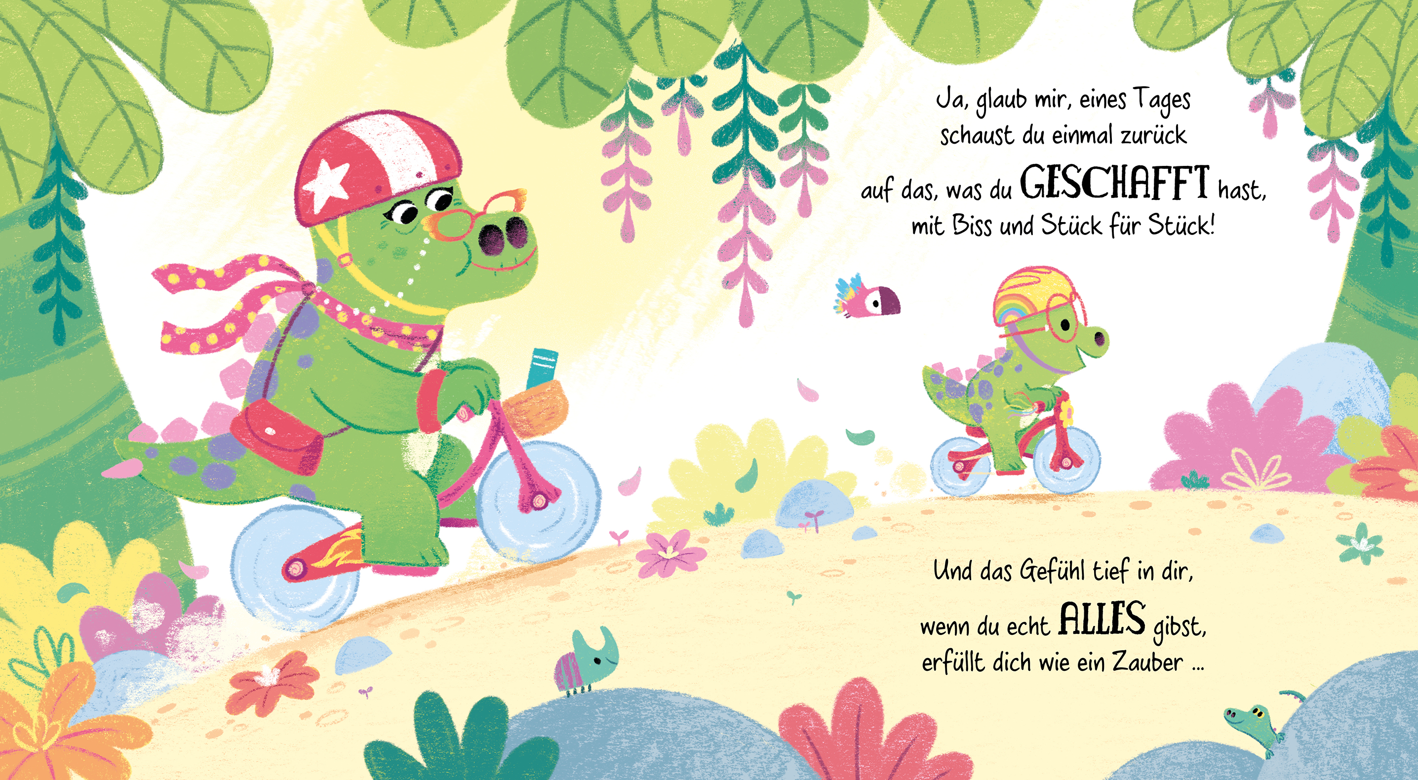 Da kommt Omasaurus angeradelt. Sie erinnert sich noch gut an die Zeit, als sie selbst ein kleiner Purzelsaurus war. Und sie weiß: Ohne Hinpurzeln geht es nicht, wichtig ist nur, dass man wieder aufsteht und es noch mal versucht!