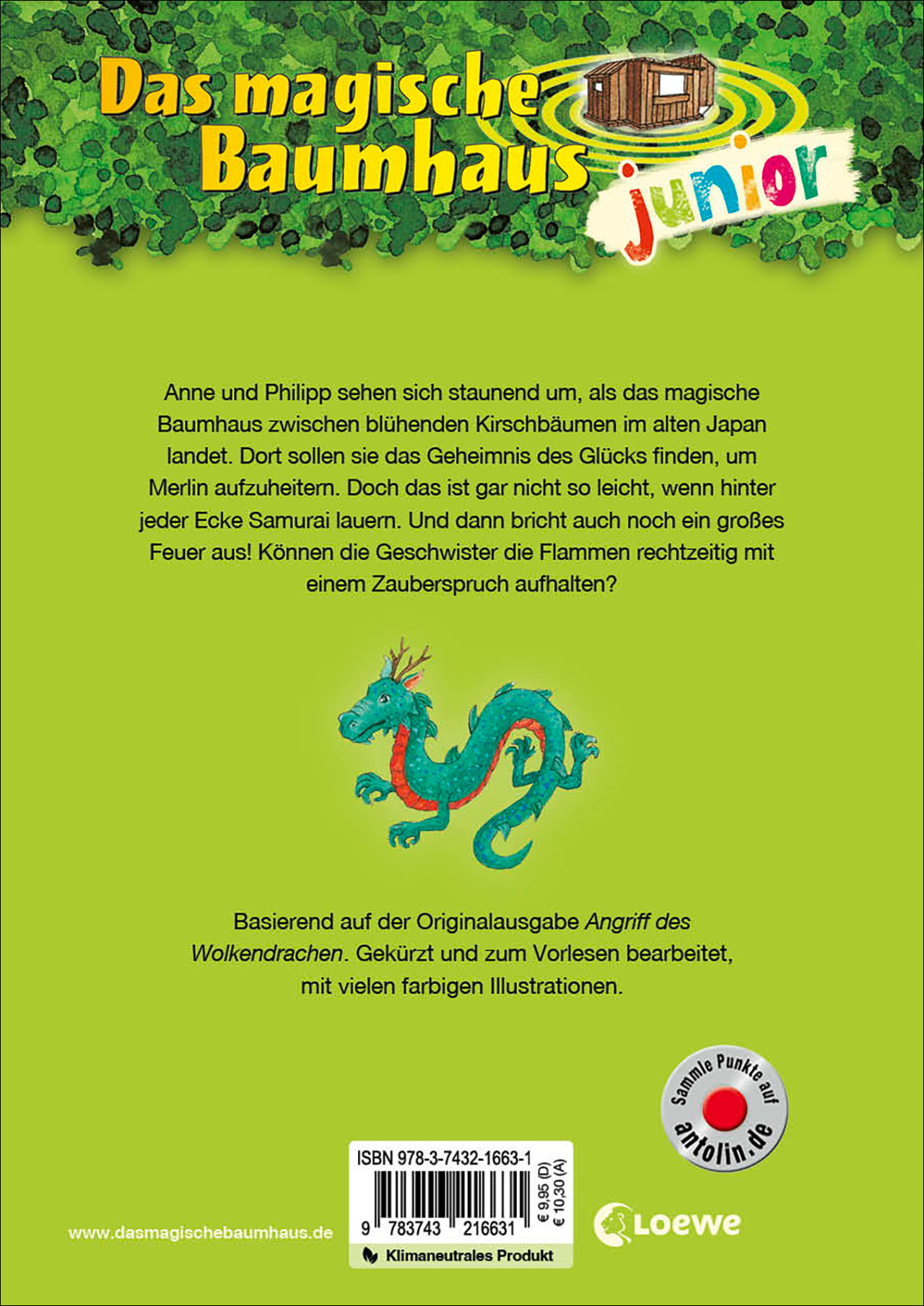 MIT DEM BAUMHAUS NACH JAPAN Die beliebte Kinderbuchreihe von Bestsellerautorin Mary Pope Osborne zum Vorlesen und ersten Selberlesen. Die Geschwister Anne und Philipp reisen mit dem magischen Baumhaus durch die Zeit, entdecken ferne Länder und erleben spannende Abenteuer. Mit vielen bunten Bildern besonders für Kinder ab 6 Jahren geeignet. Merlin geht es schlecht! Anne und Philipp haben die Aufgabe, die Geheimnisse des Glücks zu finden, um ihn aufzuheitern. Das magische Baumhaus bringt die beiden deshalb ins alte Japan, wo sie inmitten blühender Kirschbäume landen. Doch kaum angekommen, müssen die Geschwister bereits vor Samurai fliehen. Als auch noch ein Feuer in Edo ausbricht, setzen Anne und Philipp alles daran, die Stadt zu retten, und begegnen dabei dem legendären Wolkendrachen.