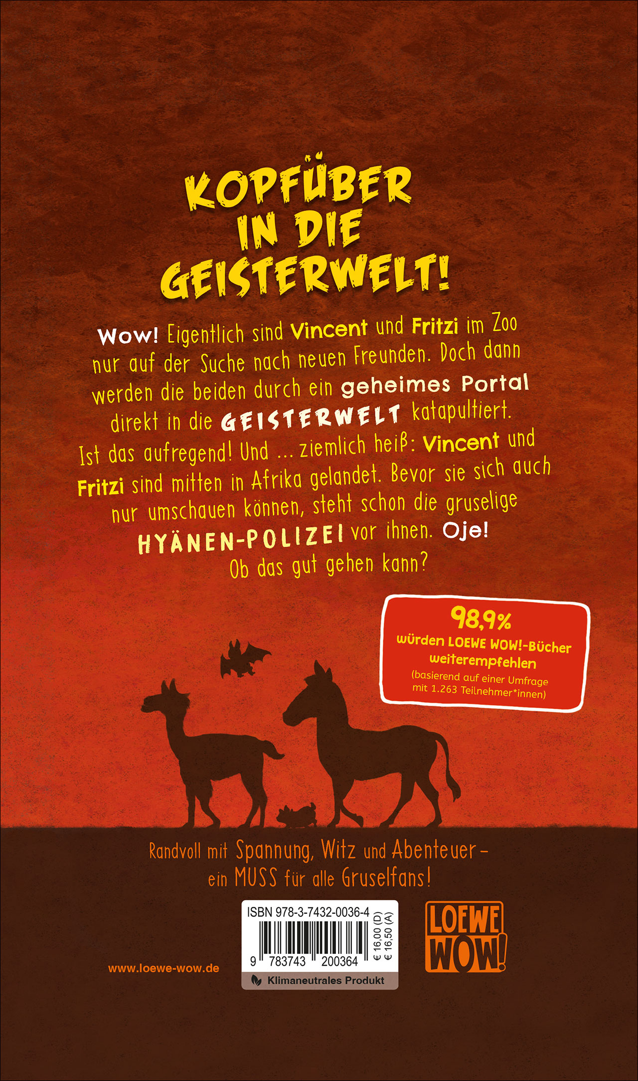Wow! Eigentlich waren Vincent und Fritzi im Zoo nur auf der Suche nach neuen Freunden. Doch dann werden die beiden durch ein geheimes Portal direkt in die Geisterwelt katapultiert. Ist das aufregend! Und ... ziemlich heiß: Vincent und Fritzi sind mitten in Afrika gelandet. Bevor sie sich auch nur umschauen können, steht schon die gruselige Hyänen-Polizei vor ihnen. Oje! Ob das gut gehen kann?