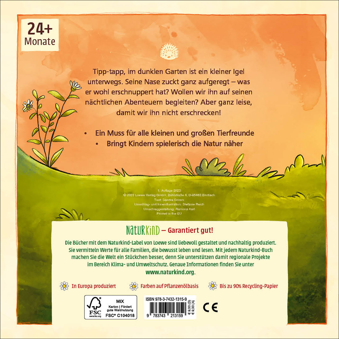 ENTDECKE DIE NATUR! So viele spannende und tolle Tiere leben in unserer Natur: im Wald, auf dem Feld, am Fluss oder im Garten. Mit dieser wunderschönen neuen Naturkind-Reihe über heimische Tiere und ihre Lebensräume lernen wir sie näher kennen. Jeder Band widmet sich erzählerisch einem anderen Tier und erkundet seine Lebensweise. Inklusive kompaktem Sachteil. Am Abend ist im Garten ein kleiner Igel unterwegs. Neugierig erkundet er alle Ecken und lässt sich einen leckeren Regenwurm schmecken. Vorsicht, da kommt ein Hund! Schnell rollt sich der Igel zusammen, bis die Gefahr vorüber ist. Puh! Nach so einer aufregenden Nacht kuschelt er sich tief in sein Blätternest und schläft rasch ein.