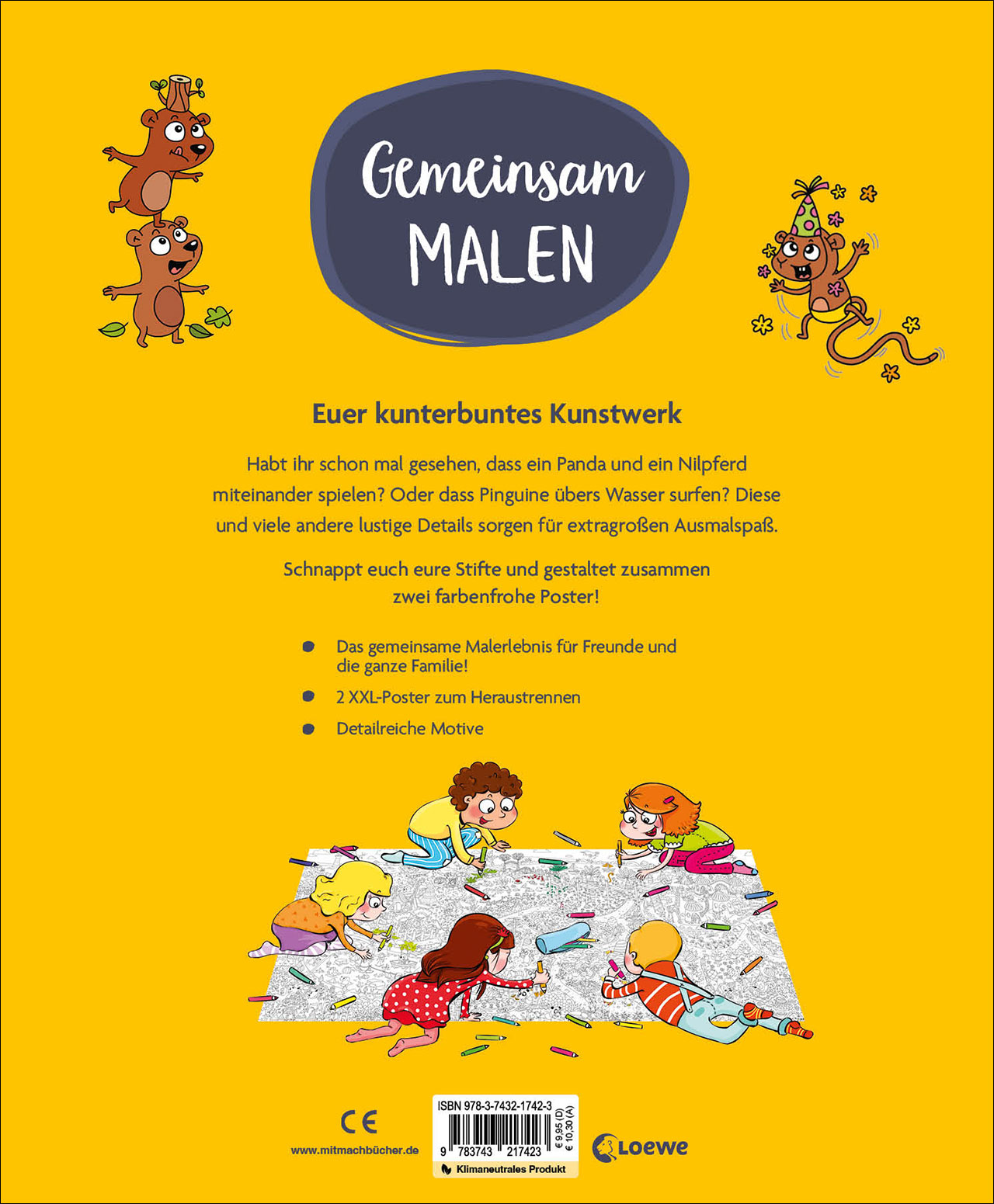 GEMEINSAM MALEN? HIER WIRD'S MÖGLICH! Hast du schon mal gesehen, dass ein Panda und ein Nilpferd zusammen wippen? Oder dass Pinguine übers Wasser surfen? Diese und viele andere lustige Details verstecken sich in den riesengroßen Ausmalmotiven. Die meisten Kinder haben Spaß am Malen. Viele kleine Künstler*innen freuen sich dabei aber auch über Unterstützung, egal ob von Geschwistern, Freund*innen oder Erwachsenen. Deshalb sorgt diese besondere Malbuchreihe gezielt für gemeinschaftlichen Malspaß. Dank der Perforierung können die riesengroßen Poster leicht herausgetrennt werden. Sie bieten viel Platz, um der Kreativität freien Lauf zu lassen und zusammen ein Bild zu gestalten. Dabei wird ganz nebenbei auch die soziale Kompetenz aller Beteiligten gestärkt. Und sind die Bilder dann ausgemalt, verschönern sie garantiert jedes Kinderzimmer!