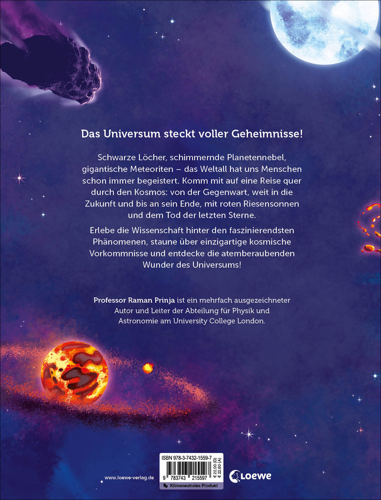 Schwarze Löcher, schimmernde Planetennebel, gigantische Meteoriten - das Weltall hat uns Menschen schon immer begeistert. Komm mit auf eine Reise quer durch den Kosmos von der Gegenwart, weit in die Zukunft und bis an sein Ende, mit roten Riesensonnen und dem Tod der letzten Sterne.