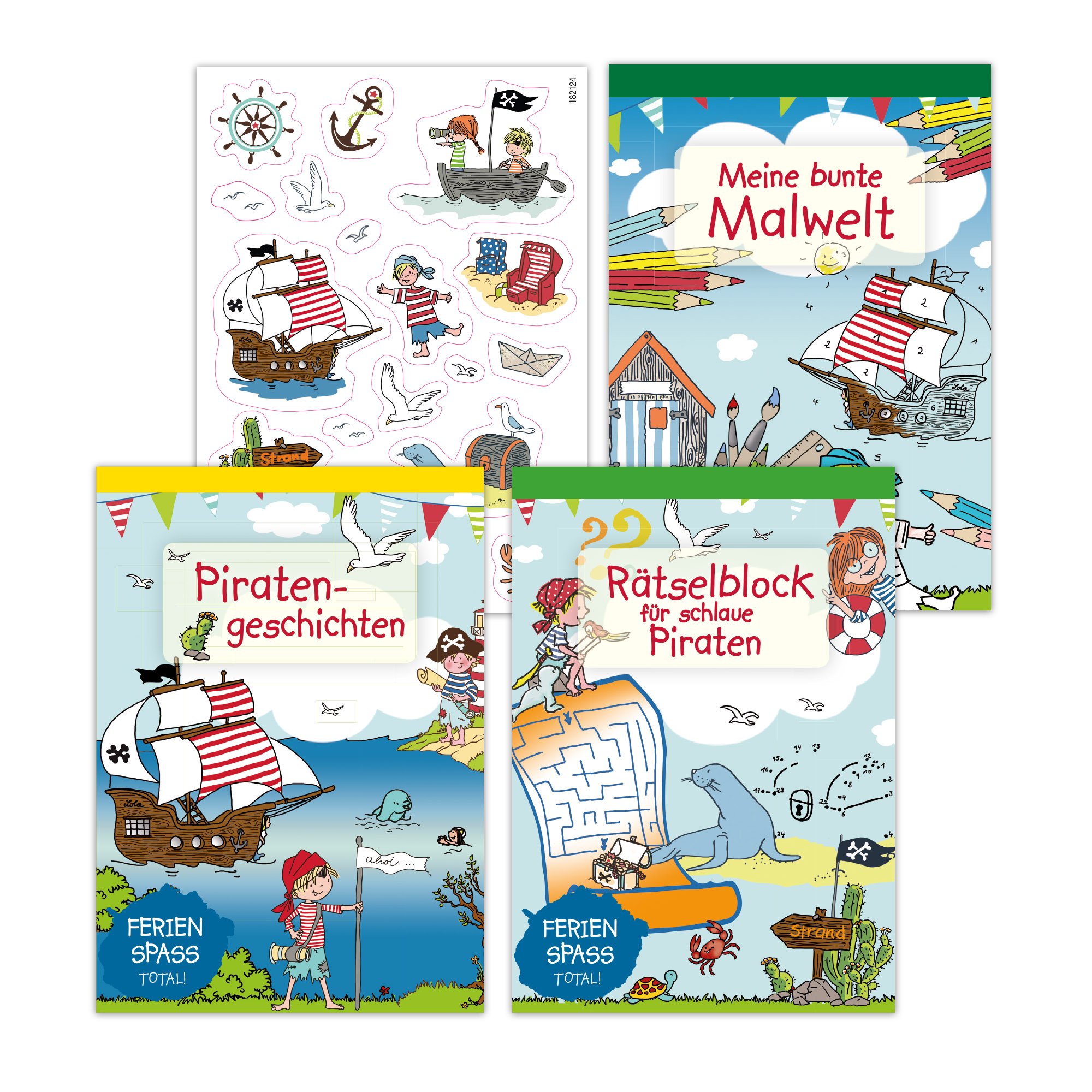 - Ein Set für alle Fälle: Geschichten-Heft, Rätselblock für schlaue Piraten, Ausmalblock und Stickerbogen in einem wasserabweisenden Etui.