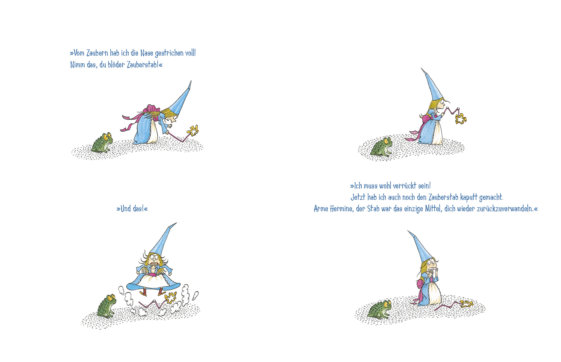 Hermine und Margo spielen im Park. Margo hat sich als Fee verkleidet. Als sie ihren Zauberstab ausprobiert - POTZBLITZ! - funktioniert dieser doch tatsächlich! Begeistert zaubert sie drauf los. Zunächst klappt das auch ganz gut, aber dann geht nach und nach Vieles schief. Als sie ihre Freundin Hermine sogar in eine Kröte verwandelt, wird die Zauberei zum Ärgernis. Vor Wut zerbricht Margo ihren Zauberstab. Doch wie soll sie nun Hermine wieder zurück verwandeln? Und wie nur soll sie das Malheur Hermines Eltern erklären?