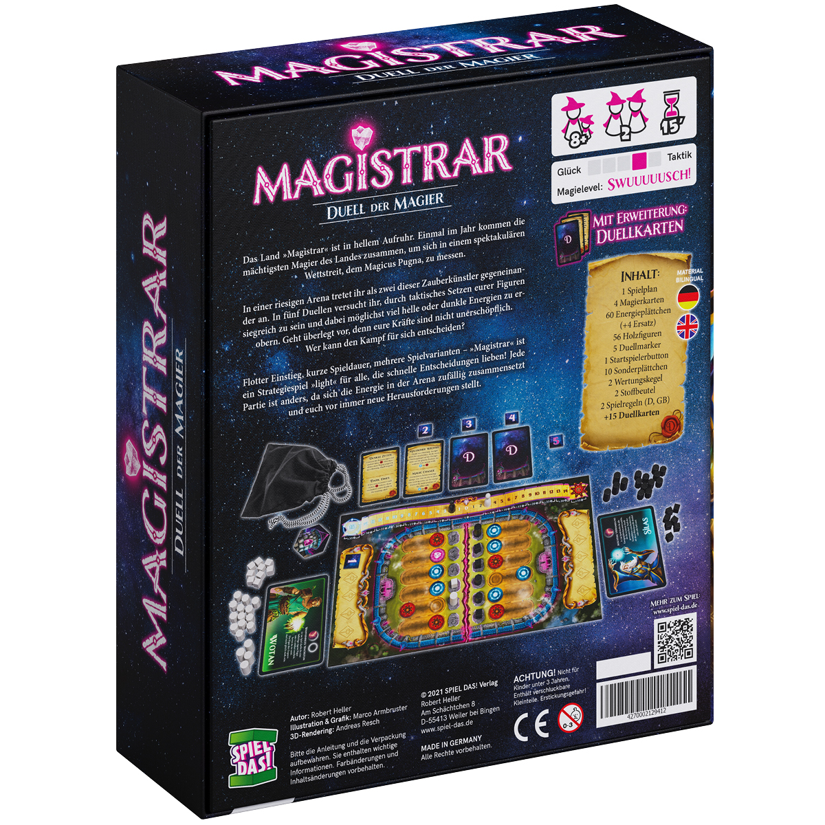 Flotter Einstieg, kurze Spieldauer, mehrere Spielvarianten. MAGISTRAR ist ein Strategiespiel „light“, für alle die schnelle Entscheidungen lie ben! Zwei Spieler:innen treten in fünf Duellen gegeneinander an. Für jedes gewonnene Duell gibt’s Punkte – genauso wie für das Sammeln möglichst vieler Plättchen eines Energietyps. Du musst mit deinen Figuren überlegt vorgehen und kannst deinem Gegner listige Fallen stellen. Jede Partie ist anders, da sich die Energie in der Arena zufällig zusammensetzt und dich vor immer neue Heraus forderungen stellt. Illustration: Marco Armbuster. Entwickler: Robert Heller.