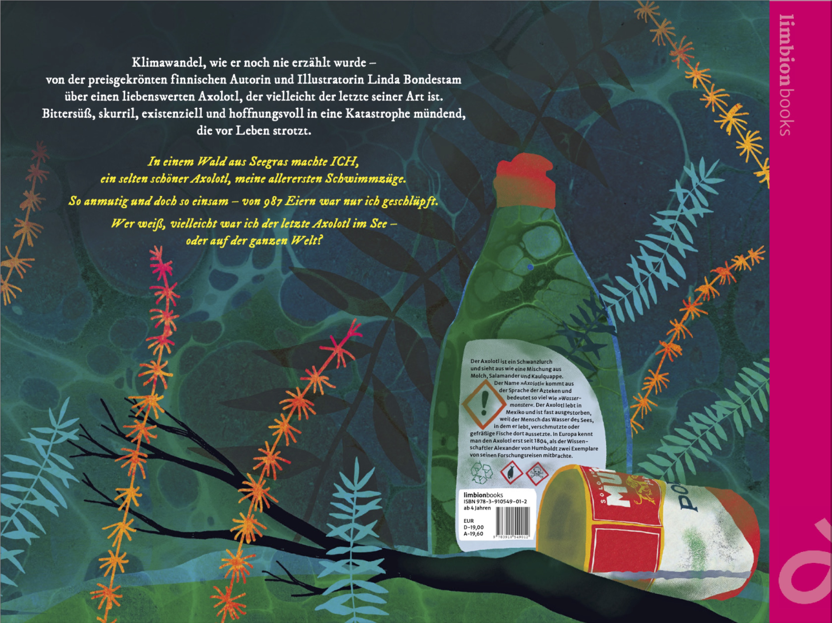 Mein Leben als einsamer Axolotl – unten am Grund ist ein ganz besonderes Kinderbuch über die Klimakrise: Linda Bondestam erschafft mit ihrem unwiderstehlichen visuellen Charme, ihrer herrlich gemalten Unterwasserwelt und großem Einfühlungsvermögen ein heitereres und zugleich eindringliches Buch über das Leben auf der Erde - das zerbrechlich und doch so widerstandsfähig ist.