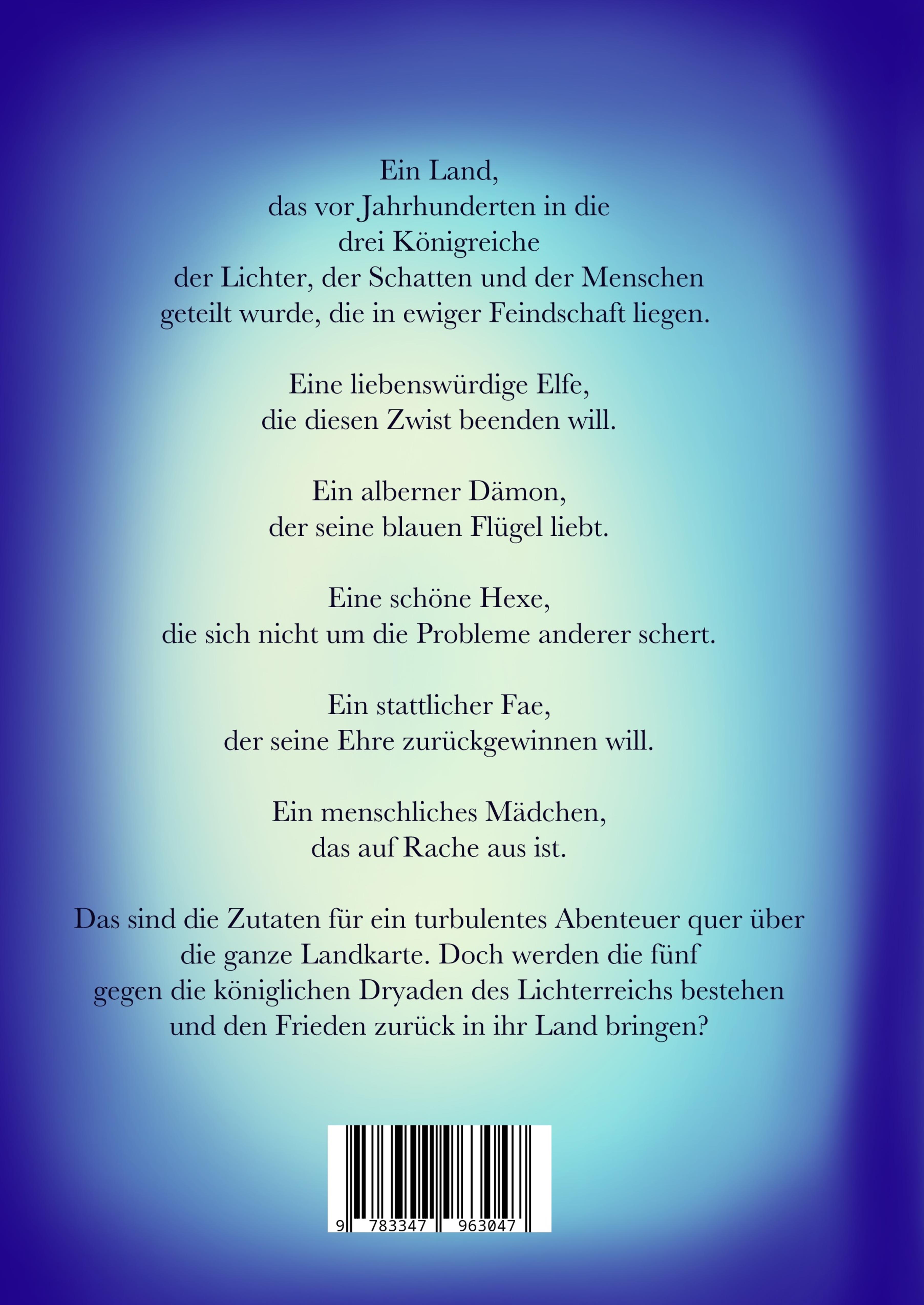 | Schlagworte | Abenteuer • Angst • Dämon • Drache • ELFA • Elfe • Fae • Fantasy • Fee • Fliegen • Flucht • Freundschaft • Geheimnis • Heilig • Hexe • Jugendlich • Kampf • Kind • König • Königreich • Krieg • Liebe • Mädchen • Magie • Mut • Palast • Prinz • Prinzessin • Reise • Tempel • Tier • Verrat • Wald • Zauber |