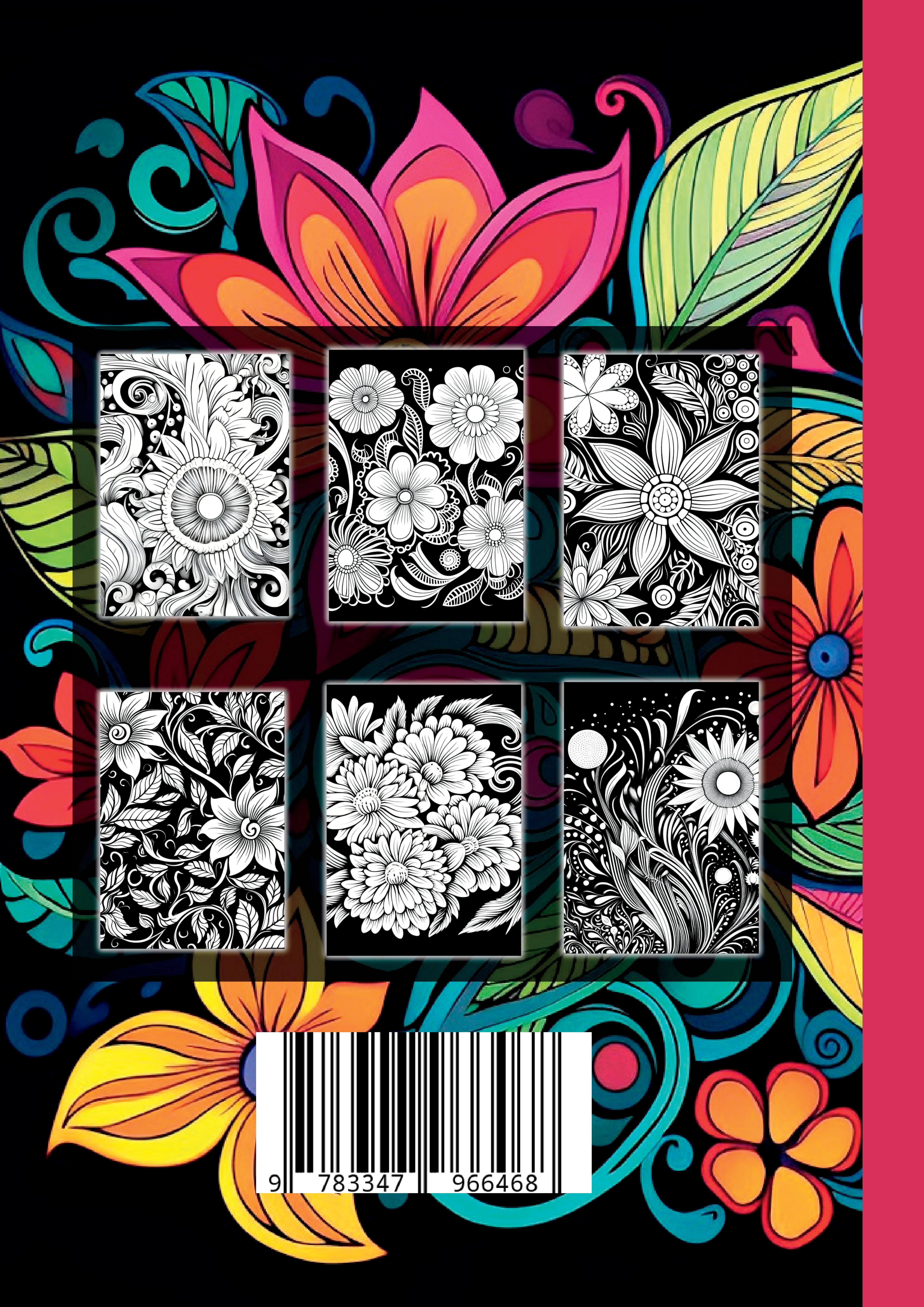 Das Blumen Malbuch mit vielen tollen Motiven auf schwarzem Hintergrund. Ausmalbuch schwarzes Papier A4. Malbuch Erwachsene Blumen. Mandala Malbuch Blumen.