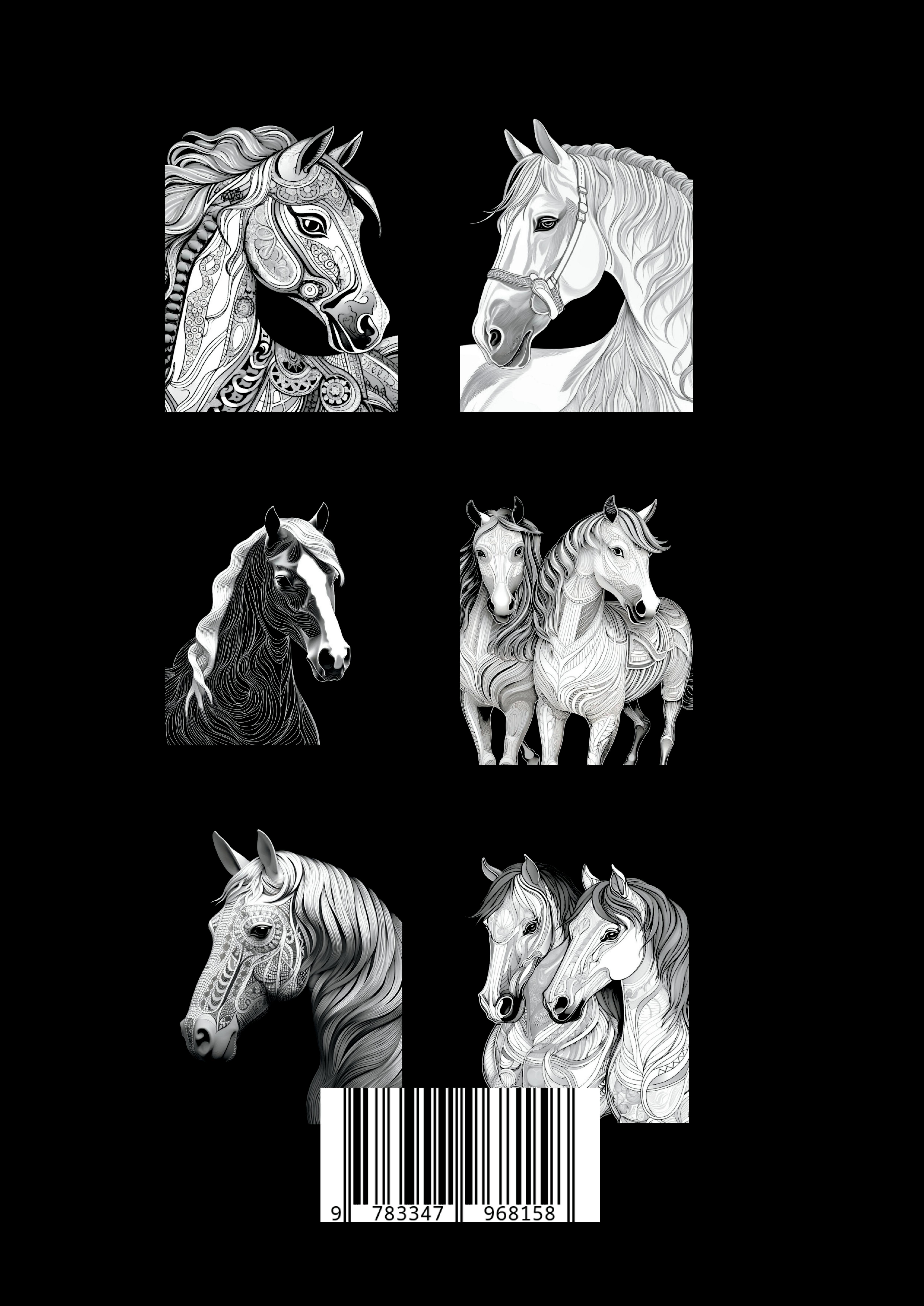 Mandala- Pferde mit außergewöhnlichen Motiven auf schwarzem Hintergrund. Malbuch Pferde. A4. Mandala Malbuch Pferde. Pferde Malbuch.