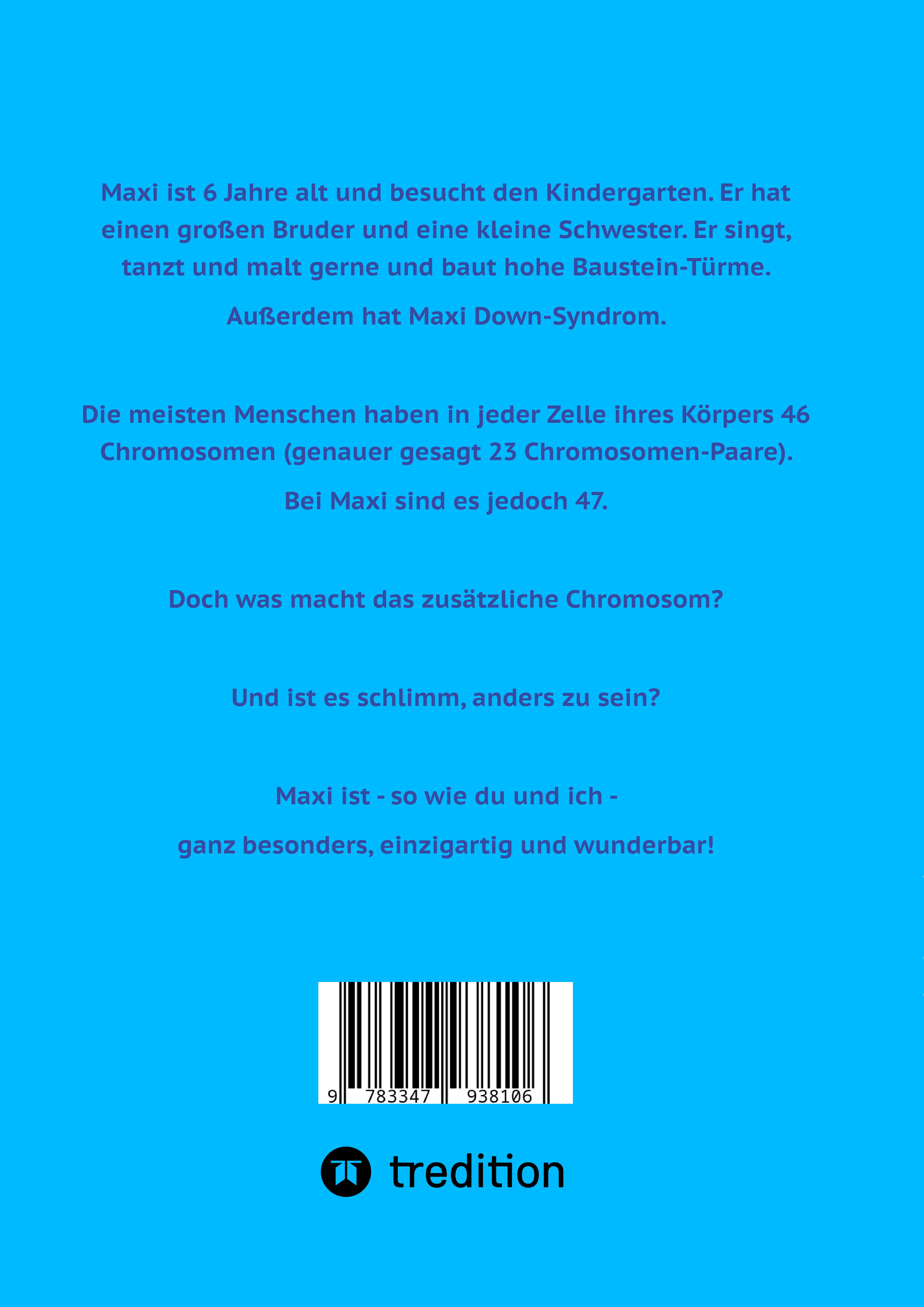 Kinder mit Behinderung werden oft an den Rand der Gesellschaft gedrängt - doch da gehören sie nicht hin.Maxi Mittendrin erzählt von Maxi, einem Buben mit Down-Syndrom. Davon, was er gerne macht, von seinen Stärken und Schwächen, seinen Therapien und seinem Alltag. Maxi ist - so wie du und ich - einzigartig, wertvoll und wunderbar!
