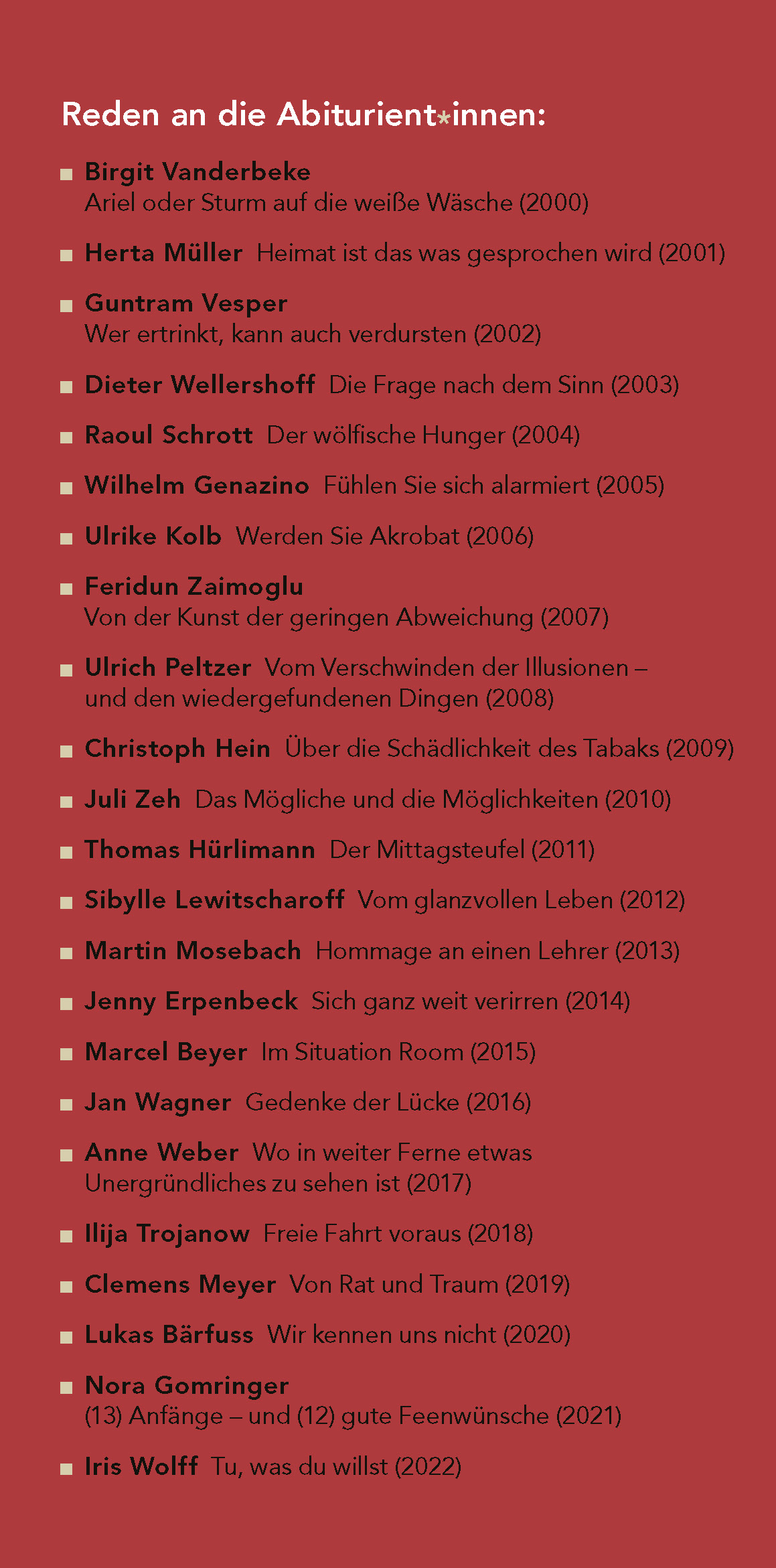 | Schlagworte | Abi • abi abschluss • abi buch • Abifeier • abi geschenk • abi geschenkideen • abirede • abitur bestanden glückwünsche • abitur bücher • Abiturienten • Abiturientinnen • Abiturrede • Abiturreden • abschlussreden • Anne Weber • Ansprachen • bekannte deutsche schriftsteller • bekannte Schriftsteller • berühmte abiturreden • Berühmte Reden • Berühmte Schriftsteller • Birgit Vanderbeke • buch abitur • bücher abi • Bücher Lebensweisheiten • Christoph Hein • Clemens Meyer • Deniz Utlu • Deutsche Autoren • Deutsche Schriftsteller • Dieter Wellershoff • Erwachsen werden • Feridun Zaimoglu • gedanken zum erwachsenwerden • geschek abiturient • Geschenk Abitur • geschenke fürs abitur • Geschenk für Abiturienten • Geschenkideen Abitur • Geschenk Schulabschluss • geschenk zum abi • geschenk zum abitur • glückwünsche zum abitur • glückwunsch schulabschluss • Guntram Vesper • Herta Müller • Ilija Trojanow • Iris Wolff • Jan Wagner • Jenny Erpenbeck • Juli Zeh • Lebensweisheiten • Love • Lukas Bärfuss • Marcel Beyer • Martin Mosebach • Matura • Mut machen • neuer Lebensabschnitt • nora gomringer • ralph Schock • Raoul Schrott • Rat für junge Menschen • rede abitur • Reden • rede zum schulabschluss • Reifeprüfung • Schulabschluss • Sibylle Lewitscharoff • Thomas Hürlimann • Ulrich Peltzer • Ulrike Kolb • weisheiten für das leben • Wilhelm Genazino • Zukunft gestalten |