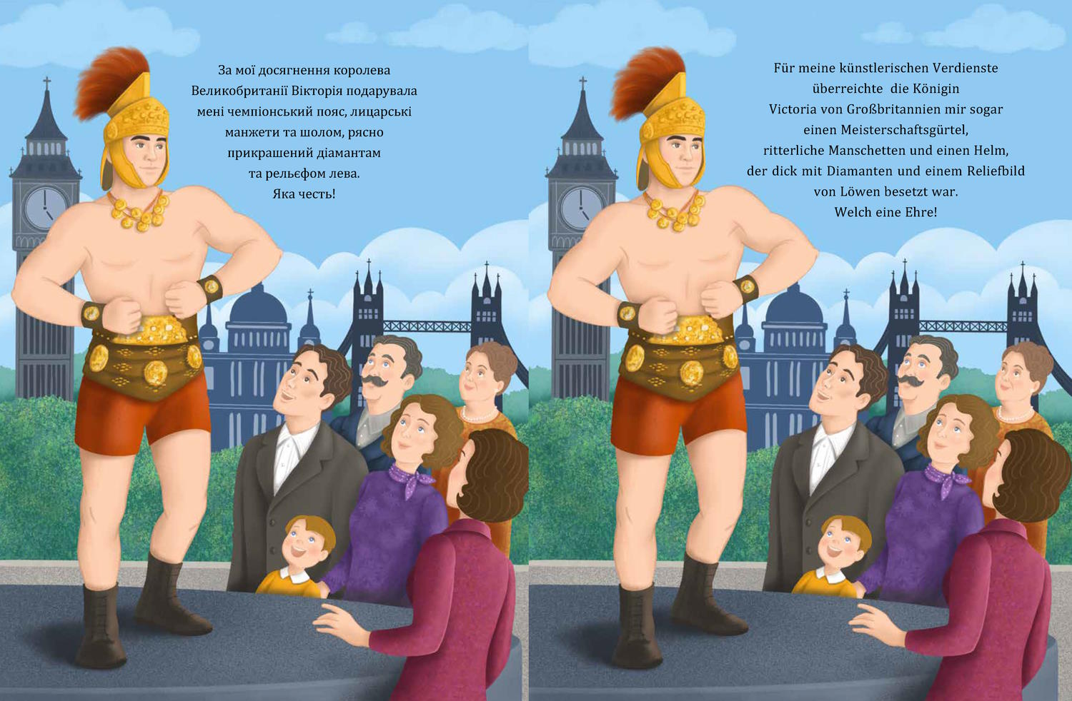 Das zweisprachige deutsch-ukrainische Bilderwendebuch erzählt in wunderschönen Illustrationen die beeindruckende Geschichte vom Ukrainer Ivan Kraft, dem seinerzeit stärksten Menschen der Welt. Bereits als kleiner Junge brachte er die Menschen in seinem Dorf durch seinen Mut und seine außergewöhnliche Stärke zum Staunen. Als junger Mann zog es ihn zum Zirkus, mit dem er die weite Welt bereiste. Aus zahlreichen Sportwettkämpfen wie Ringen und Gewichtheben ging er als Sieger hervor. In den Zirkusarenen auf der ganzen Welt begeisterte er die Zuschauer und Zuschauerinnen. Auf seinen jahrelangen Reisen lernte er sagenhafte vierzehn Sprachen! Zurück in seiner Heimat, eröffnete er eine Sportschule, wo er junge Menschen förderte und zu erfolgreichen Sportlern ausbildete. Seine Errungenschaften sind in einer Enzyklopädie festgehalten und, um ihn zu ehren, wurde ihm sogar ein Denkmal in seiner Heimatstadt Bilky errichtet.