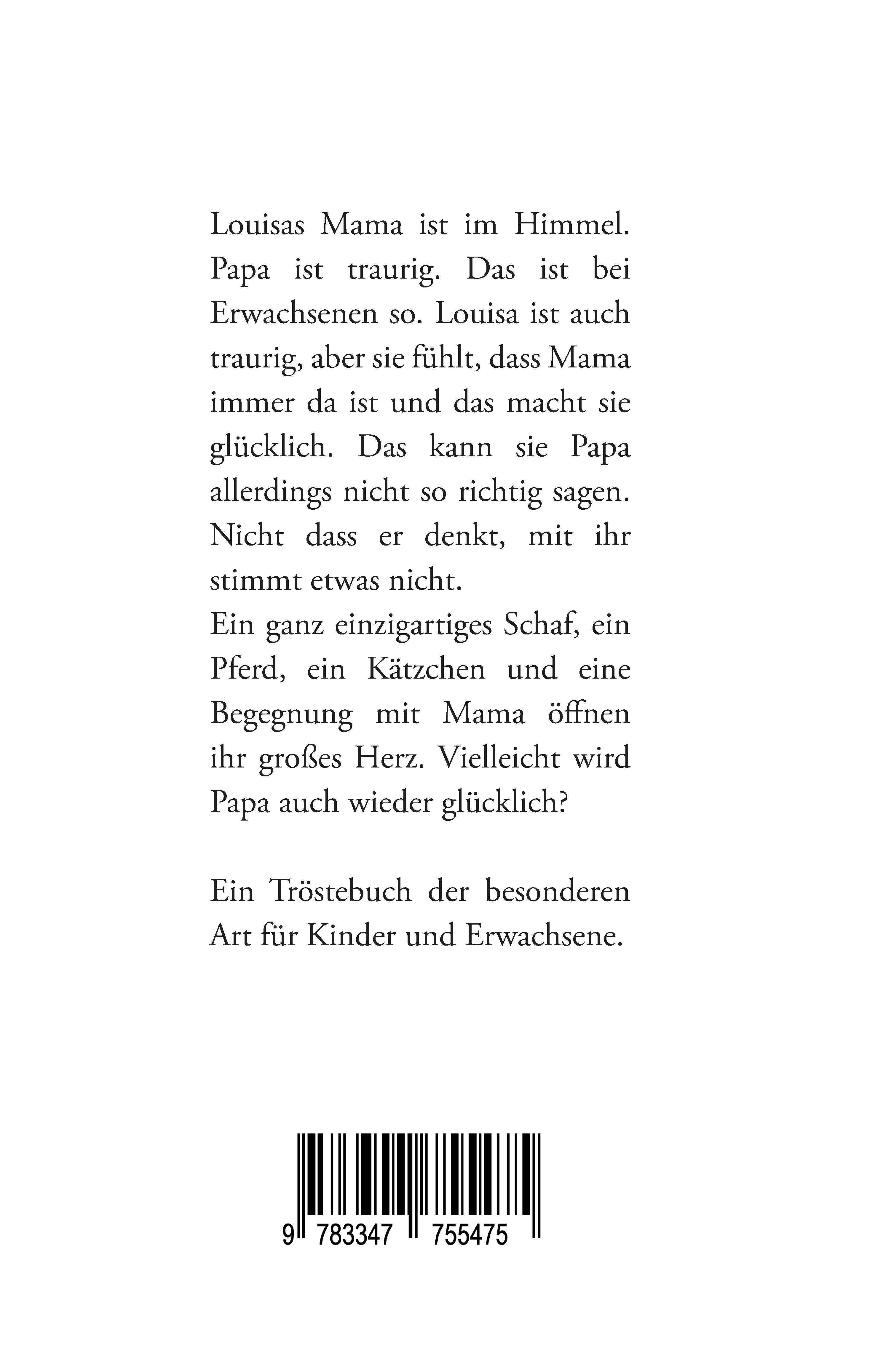 Louisas Mama ist im Himmel. Papa ist traurig. Das ist bei Erwachsenen so. Louisa ist auch traurig, aber sie fühlt, dass Mama immer da ist und das macht sie glücklich. Das kann sie Papa allerdings nicht so richtig sagen. Nicht dass er denkt, mit ihr stimmt etwas nicht.Ein ganz einzigartiges Schaf, ein Pferd, ein Kätzchen und eine Begegnung mit Mama öffnen ihr großes Herz. Vielleicht wird Papa auch wieder glücklich?