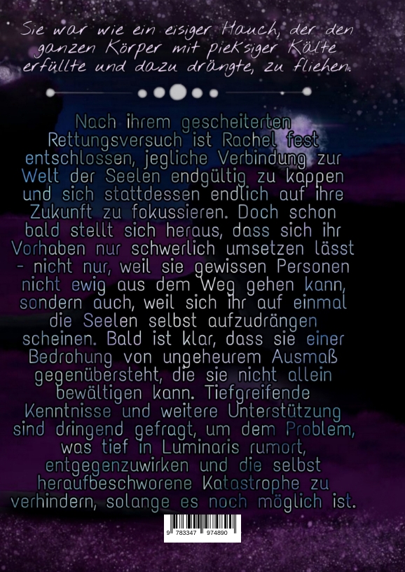 | Schlagworte | Abenteuer • Beziehung • Eltern • Fabelwesen • Familie • Fantasiewesen • Fantasy • Freundschaft • Geheimnis • Hoffnung • humorvoll • Liebe • Luminaris • Magie • Magische Fähigkeiten • Merle • Nico • Nicolas • Oma Lieselotte • Opa Hermann • Parallelwelt • Quicks • Rachel • Reise • Schicksalsschlag • Seele • Seelen • Seelensehen • Spannung • Tod • Verlust • WiSpy |