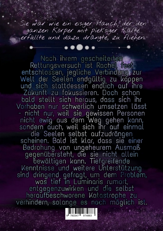 | Schlagworte | Abenteuer • Beziehung • Eltern • Fabelwesen • Familie • Fantasiewesen • Fantasy • Freundschaft • Geheimnis • Hoffnung • humorvoll • Liebe • Luminaris • Magie • Magische Fähigkeiten • Merle • Nico • Nicolas • Oma Lieselotte • Opa Hermann • Parallelwelt • Quicks • Rachel • Reise • Schicksalsschlag • Seele • Seelen • Seelensehen • Spannung • Tod • Verlust • WiSpy |