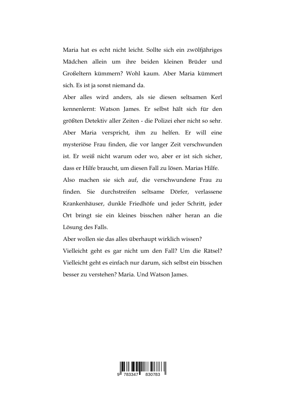 Maria hat es echt nicht leicht. Sollte sich ein zwölfjähriges Mädchen allein um ihre beiden kleinen Brüder und Großeltern kümmern? Wohl kaum. Aber Maria kümmert sich. Es ist ja sonst niemand da. Aber alles wird anders, als sie diesen seltsamen Kerl kennenlernt: Watson James. Er selbst hält sich für den größten Detektiv aller Zeiten - die Polizei eher nicht so sehr. Aber Maria verspricht, ihm zu helfen. Er will eine mysteriöse Frau finden, die vor langer Zeit verschwunden ist. Er weiß nicht warum oder wo, aber er ist sich sicher, dass er Hilfe braucht, um diesen Fall zu lösen. Marias Hilfe. Also machen sie sich auf, die verschwundene Frau zu finden. Sie durchstreifen seltsame Dörfer, verlassene Krankenhäuser, dunkle Friedhöfe und jeder Schritt, jeder Ort bringt sie ein kleines bisschen näher heran an die Lösung des Falls. Aber wollen sie das alles überhaupt wirklich wissen? Vielleicht geht es gar nicht um den Fall? Um die Rätsel? Vielleicht geht es einfach nur darum, sich selbst ein bisschen besser zu verstehen? Maria. Und Watson James.