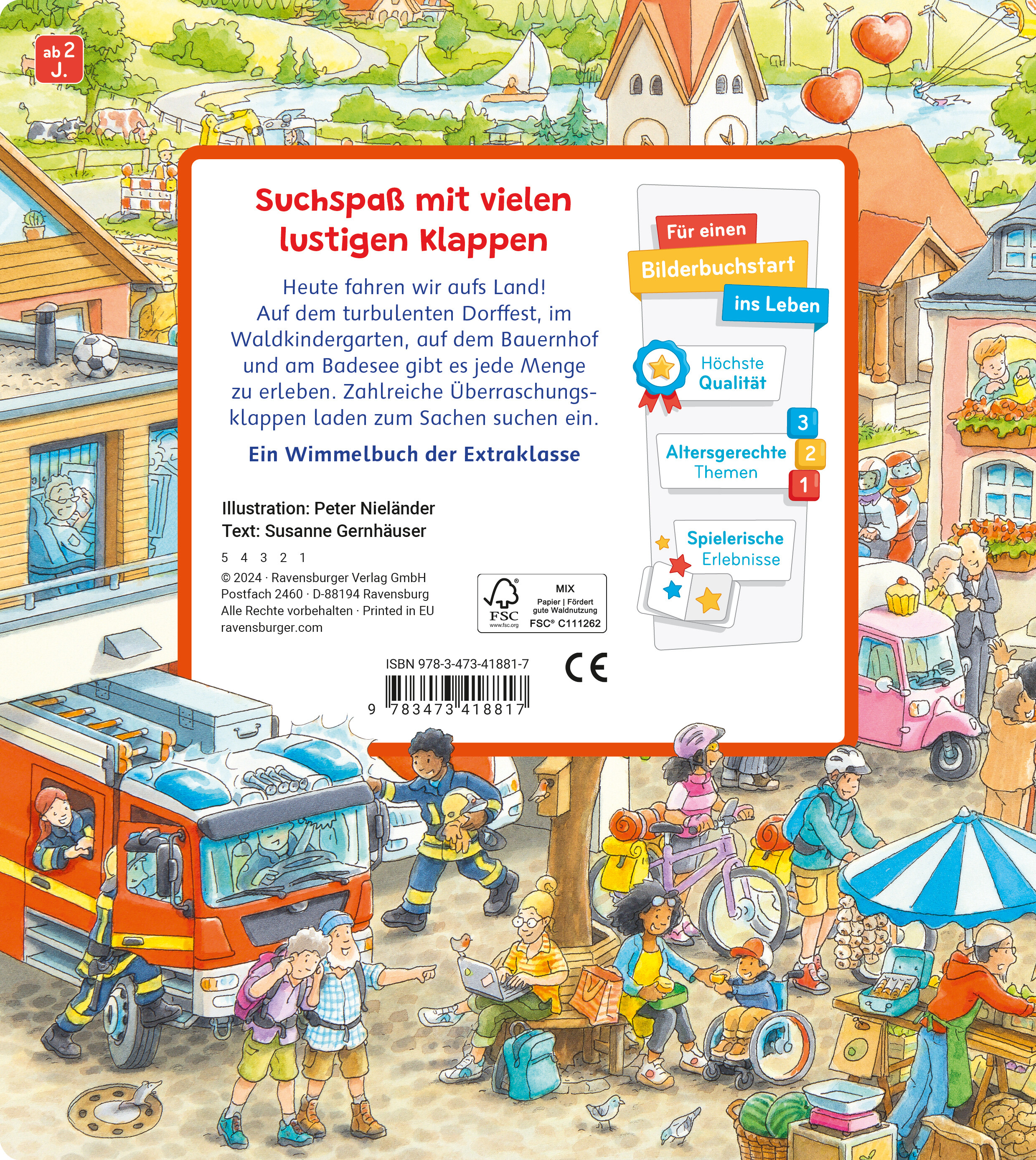 Heute fahren wir aufs Land! Das macht Spaß und es gibt dort jede Menge Such- und Findespaß. Auf und hinter vielen Klappen finden sich lustige Überraschungen. Sieben Schaubilder zeigen das Dorf mit seinen großen und kleinen Bewohnern: einen Bauernhof und alles, was es dort zu tun gibt, einen Waldkindergarten, ein Naturschwimmbad im Sommer, das turbulente Dorffest mit Musik und einen Blick auf die Baumschule, die im Winter Tannenbäume verkauft. Ein Wimmelbuch der Extraklasse!