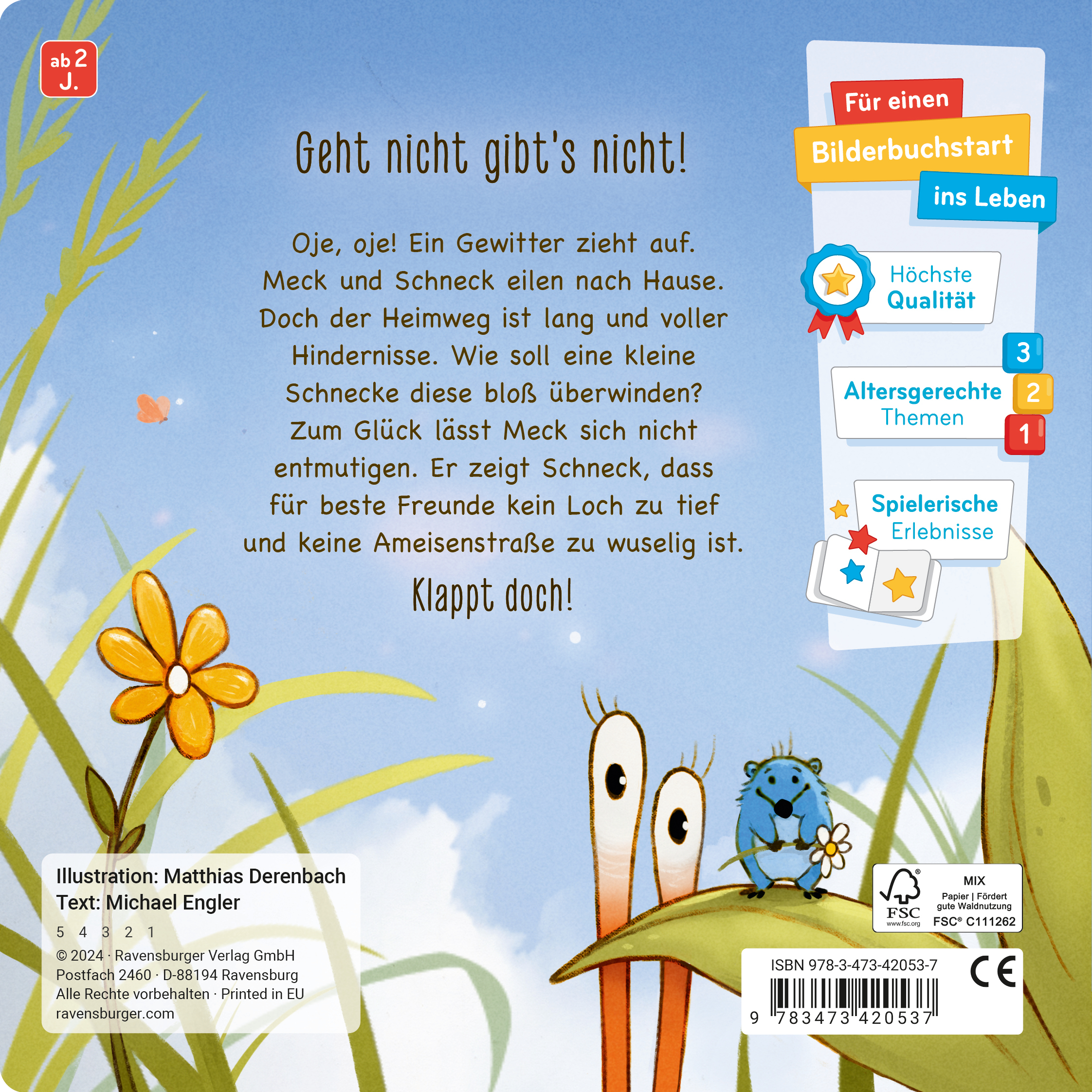 Ein neues Abenteuer mit Meck und Schneck! Schneck entdeckt eine große Regenwolke mit Blitz und Donner am Himmel. Nun aber schnell zurück zur Höhle. Aber auf ihrem Weg ins sichere Versteck warten ungeahnte Hindernisse auf die Freunde. Was kann eine kleine Schnecke dagegen bloß ausrichten? Doch Meck zeigt Schneck, dass für beste Freunde kein Weg zu weit, kein Loch zu tief und keine Ameisenstraße zu wuselig ist!
