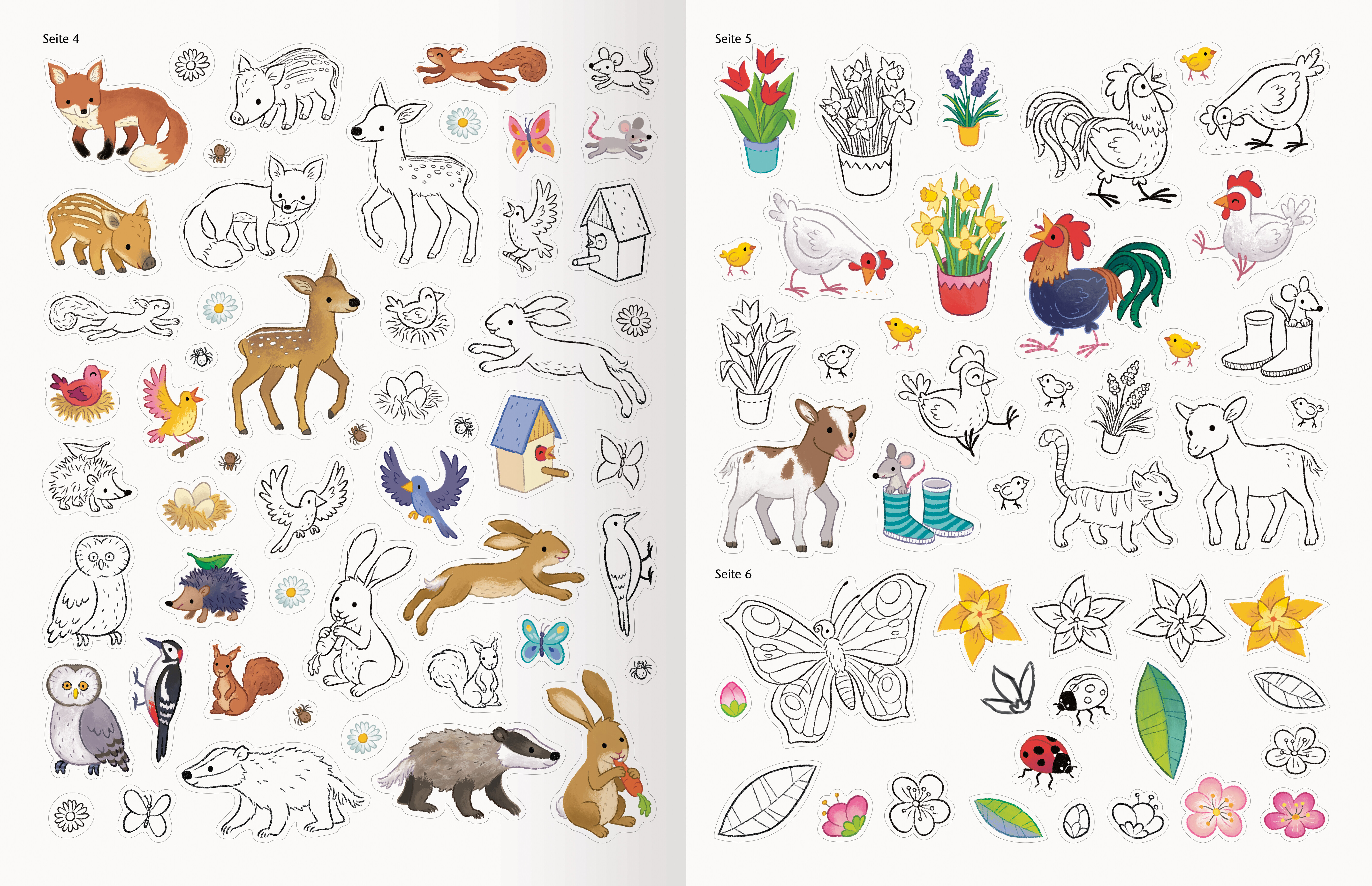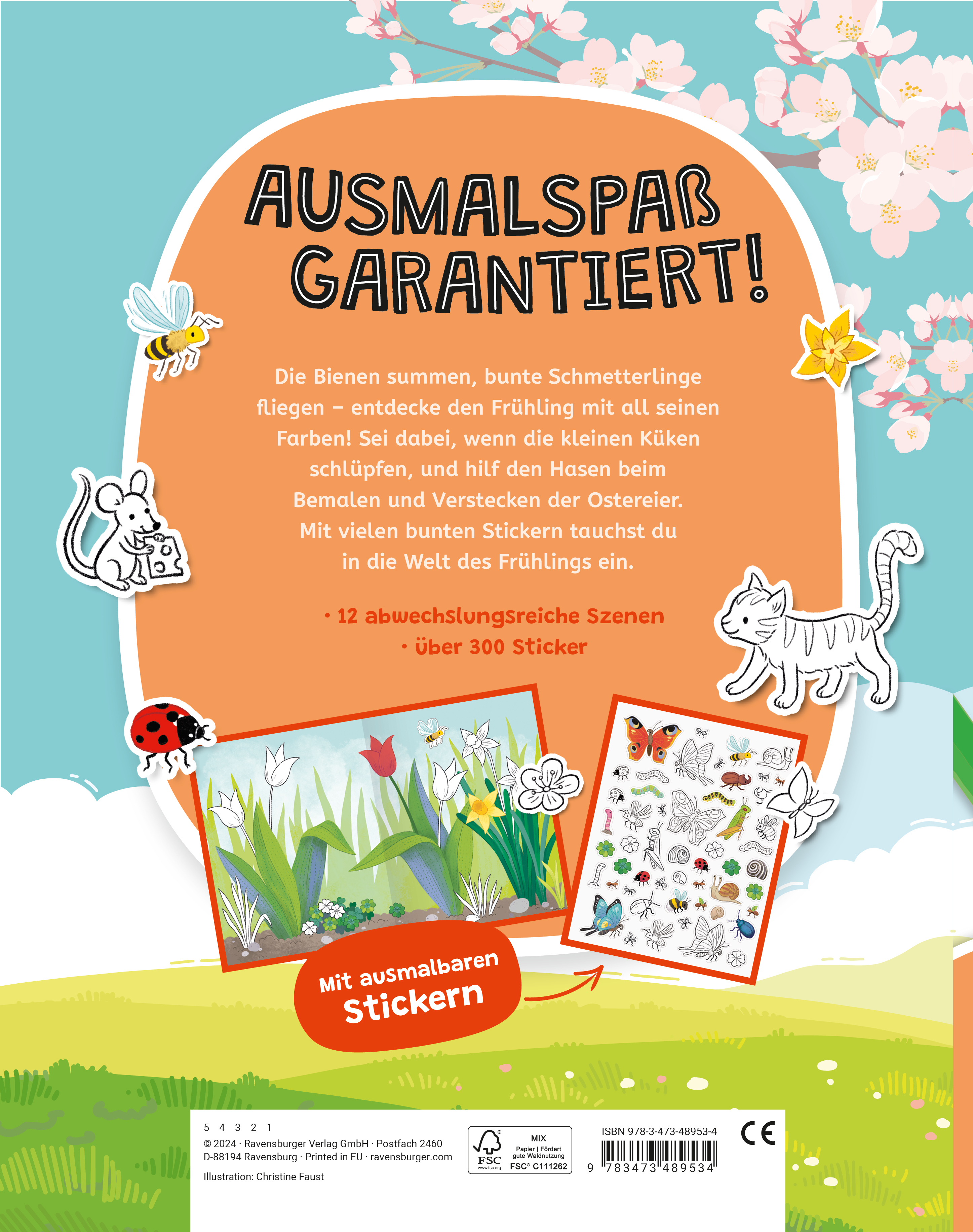 Von einer bunt blühenden Frühlingswiese über ein Picknick auf einer saftig grünen Wiese bis hin zu einer lustigen Eiersuche mit süßen Hasen und bunten Eiern finden Kinder in diesem Heft 12 abwechslungsreiche Szenen zum individuellen Gestalten. Mit über 300 Stickern können sie nach Lust und Laune kreativ sein und stickern was das Zeug hält. DAS BESONDERE: Nicht nur die Szenen können ausgemalt werden, viele der Sticker selbst sind AUSMALBAR!
