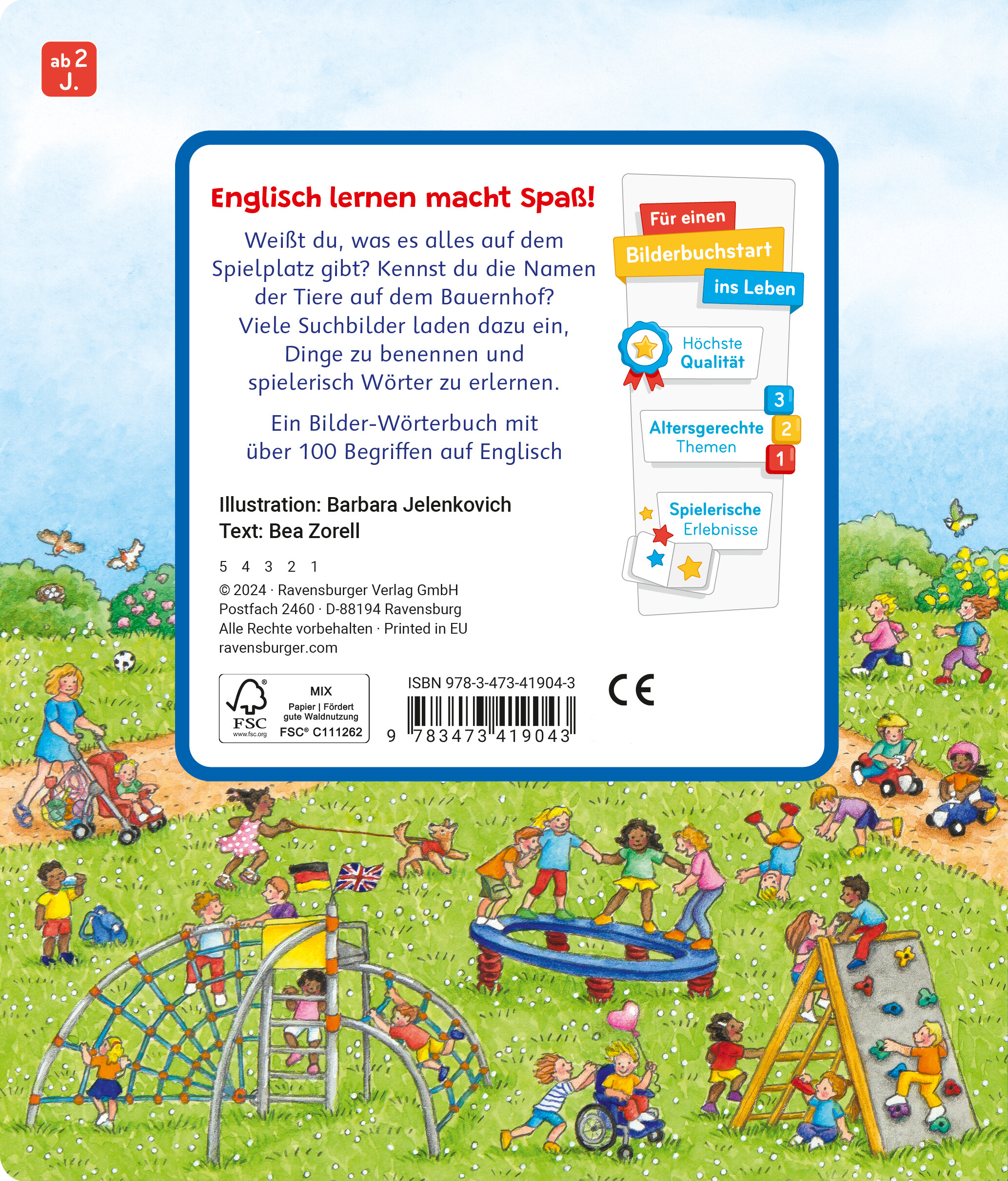 Dieses kunterbunte Bilderbuch lädt Kinder dazu ein, spielerisch erste englische Begriffe kennenzulernen. Auf 11 großen Schaubildern geht es um die Familie, die Freunde, den Kindergarten und den Spielplatz. Auch bei einer Fahrt mit dem Zug, auf der Baustelle und im Zoo bei den Tieren gibt es zahlreiche erste Begriffe auf Deutsch und Englisch zu entdecken. Unterstützt durch den beliebten "Sachen suchen"-Spieleffekt werden schon kleine Kinder neugierig mit viel Freude den Klang der fremden Sprache erforschen. So werden sie schon früh auf die Vielfalt in der Gesellschaft vorbereitet. Ein erstes bilinguales Wörterbuch für die ganze Familie.