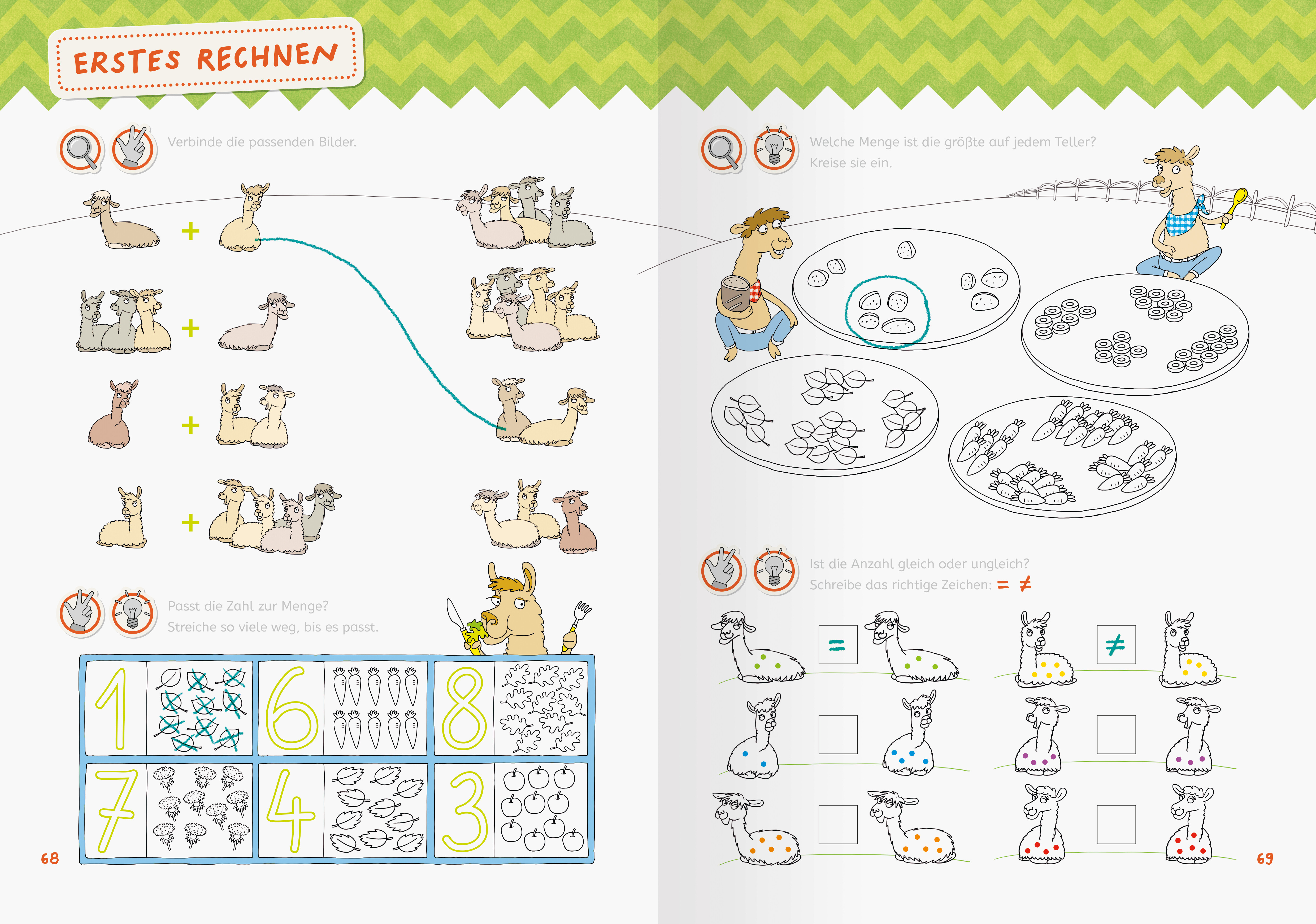 Eindeutige Symbole und Beispiele geben vor, wie die Aufgaben gelöst werden sollen, sodass Kinder auch ohne Lesekenntnisse selbstständig mit diesem Buch lernen können.