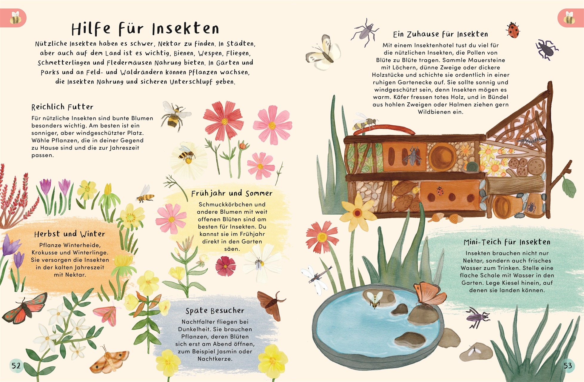 - Achtsam mit der Umwelt: Wasser sparen, Naturmaterialien verwenden, Insekten anlocken, saisonal ernten und essen.