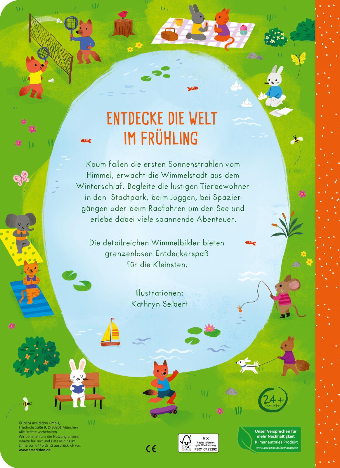 Kaum fallen die ersten Sonnenstrahlen vom Himmel, erwacht Wimmelstadt aus dem Winterschlaf. Im Stadtpark sind die ersten Jogger, Spaziergänger und Radfahrer unterwegs. Schau, dort wird ein Picknick gemacht! Natürlich finden auch schon erste Vorbereitungen für Ostern statt. Begleite die lustigen Bewohner von Wimmelstadt an den See, beim Frühlingsausflug und bei der Ostereiersuche im Garten und finde und erlebe viele lustige und spannende Abenteuer. Das große Format bietet grenzenlosen Entdeckerspaß für Kleinkinder ab 18 Monaten!