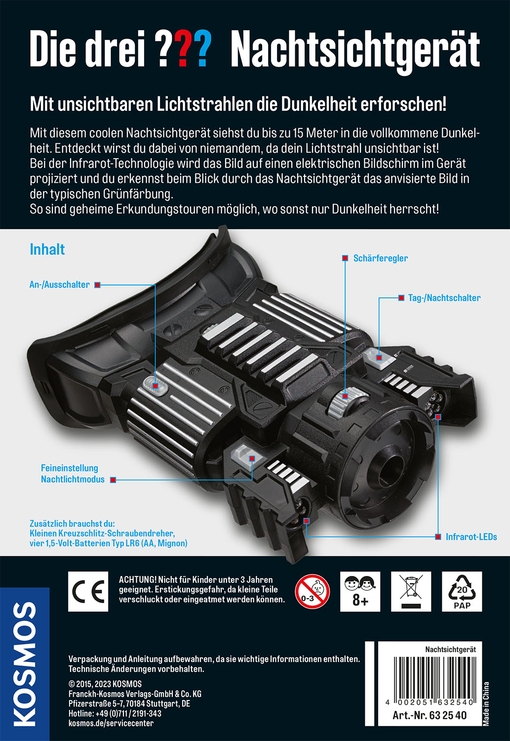 Hightech-Gadget fürs Detektiv-Spiel: Hochwertiges Nachtsichtgerät mit Infrarottechnik, die 15 Meter Sichtweite in absoluter Dunkelheit ermöglicht. Mit Schärferegler und 2 Leistungsstufen. Durch das unsichtbare Licht der Infrarot-LED selbst unbemerkt bleiben. Gerät als Fernglas im Tag- und Nachtmodus nutzbar. Ermittlungen am Tatort - Junge Detektive ab 8 Jahren können mit dem Nachsichtgerät spannende Beobachtungen im Dunkeln machen. Fördert Kreativität: Durch das Rollenspiel entfalten die Kinder ihren Einfallsreichtum und ihre Fantasie. Schult den Blick für Details und das Gedächtnis. Hat sich da hinten etwas bewegt? Versteckt sich jemand hinter dem Baum? Mit dem Nachtsichtgerät mit Schärferegler bleibt nichts mehr verborgen! Auch in der größten Dunkelheit lassen sich Personen und Objekte in bis zu 15 Metern Entfernung entdecken. Durch das unsichtbare Licht der Infrarot-LED bleiben die Beobachtenden dabei selbst unbemerkt. Etwas ist noch nicht gut genug erkennbar? Mit dem integrierten Fernrohr werden die Objekte einfach näher herangeholt. Die Anleitung erklärt, wie das Gerät im Tag- und Nachmodus funktioniert und liefert Tipps. Ein cooles Gadget für Kinder ab acht Jahren, die genauso gerne ermitteln wie die drei ??? aus Rocky Beach.