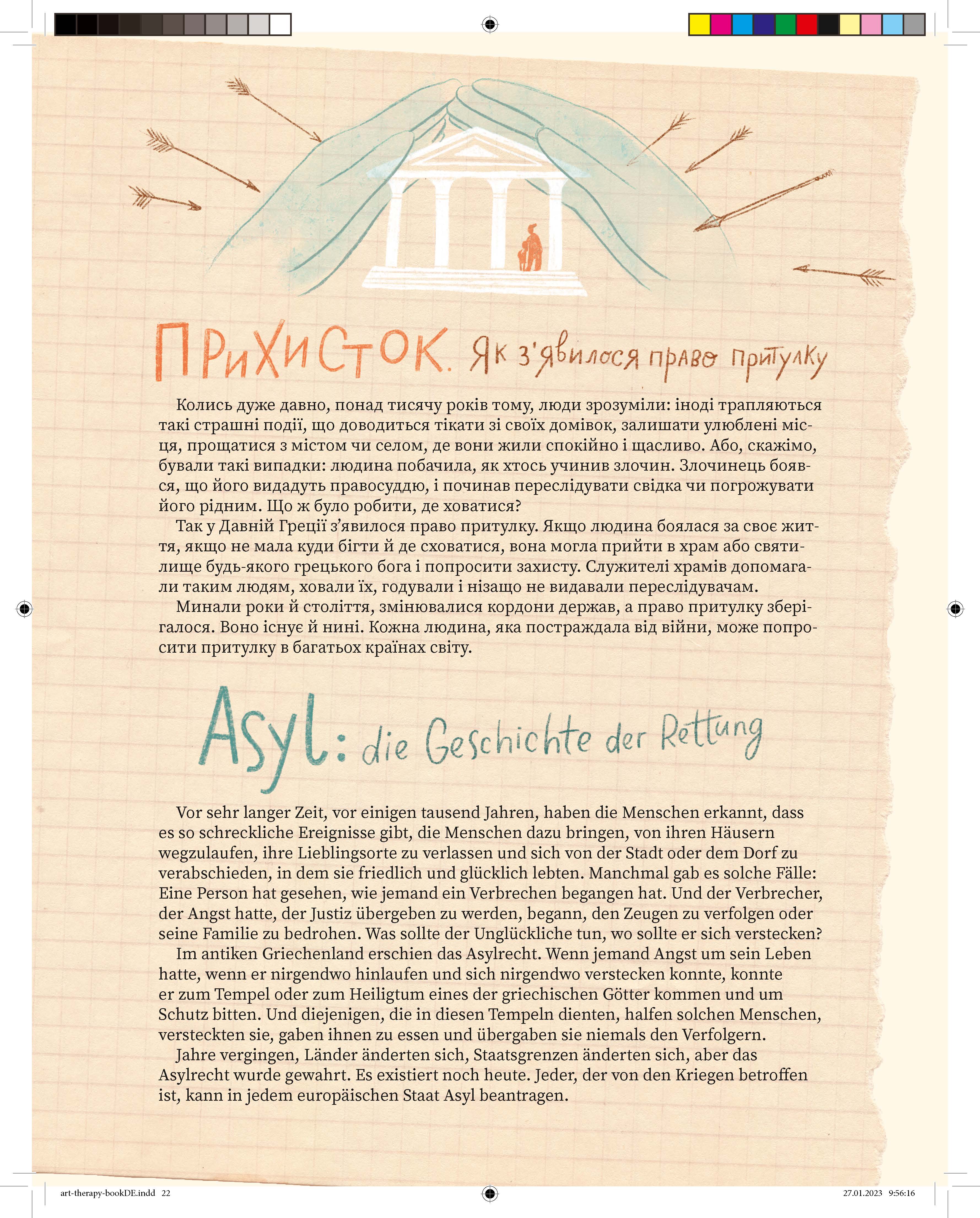 Книга для детей, вынужденных из-за войны адаптироваться к новым условиям, во многих случаях – к новому языку и стране. Она состоит из нескольких историй и творческих заданий, созданных в соответствии с методами арт-терапии и сказкотерапии. А еще эта книга будет полезна для изучения немецкого языка, потому что она двуязычная: текст на каждом развороте дублируется на украинском и на немецком языке.