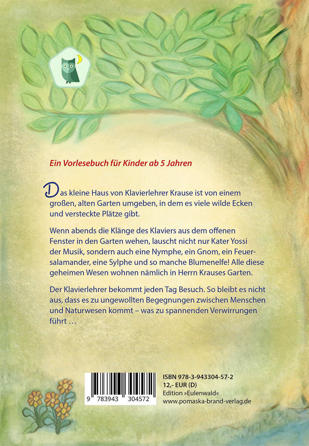 Das kleine Haus von Klavierlehrer Krause ist von einem großen, alten Garten umgeben, in dem es viele wilde Ecken und versteckte Plätze gibt. Wenn abends die Klänge des Klaviers aus dem offenen Fenster in den Garten wehen, lauscht nicht nur Kater Yossi der Musik, sondern auch eine Nymphe, ein Gnom, ein Feuersalamander, eine Sylphe und so manche Blumenelfe! Alle diese geheimen Wesen wohnen nämlich in Herrn Krauses Garten. Der Klavierlehrer bekommt jeden Tag Besuch. So bleibt es nicht aus, dass es zu ungewollten Begegnungen zwischen Menschen und Naturwesen kommt – was zu spannenden Verwirrungen führt …