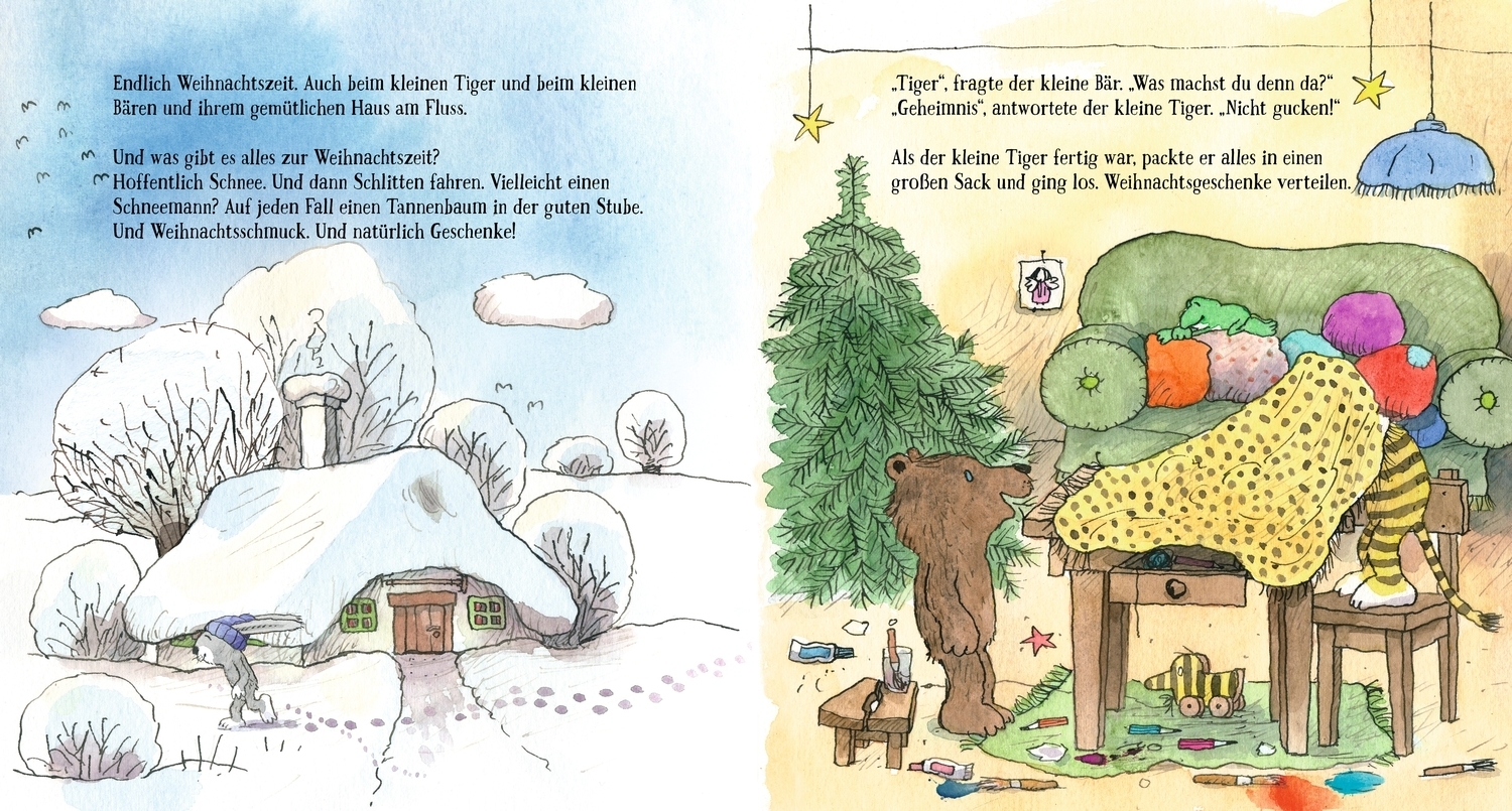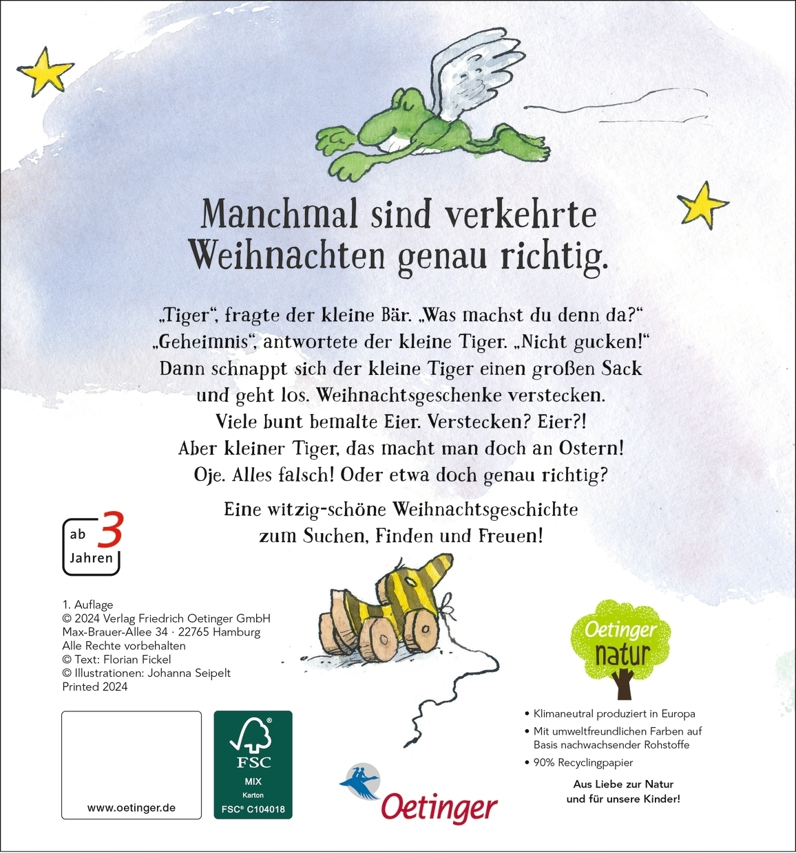 lt;p>Hurra, bald ist Weihnachten! Der kleine Tiger schnappt sich einen großen Sack voller bemalter Eier und tapst los. Weihnachtsgeschenke verstecken. Verstecken? Eier?! Aber kleiner Tiger, das macht man doch an Ostern! Oje. Als der kleine Tiger seinen Fehler bemerkt, sind schon alle Eier versteckt. Wie gut, dass er den kleinen Bären hat. Der hilft beim Suchen. Genau wie alle anderen Freunde. Ob sie gemeinsam wohl alle Geschenke vom Tiger finden werden?