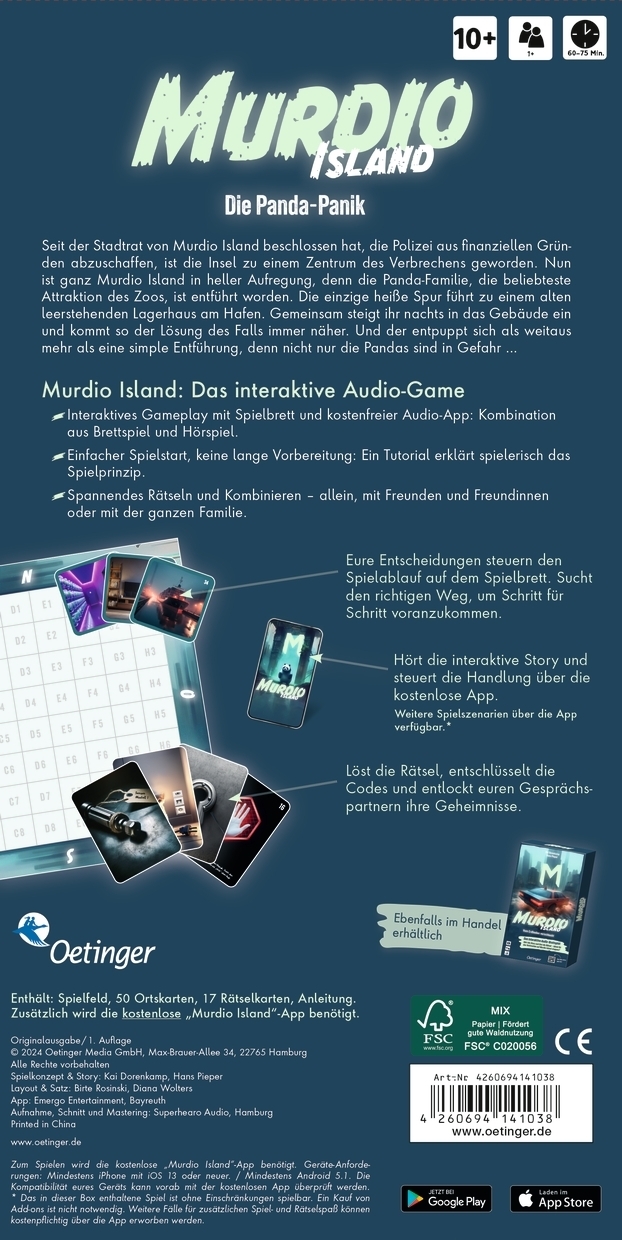 Ganz Murdio Island ist in heller Aufregung, denn die Panda-Familie, die beliebteste Attraktion im Zoo der Insel, ist über Nacht aus ihrem Gehege verschwunden. Eine Entführung? Eine heiße Spur führt zu einem alten Lagerhaus im Hafen, das angeblich schon seit Jahren leer steht. Und jetzt kommst du ins Spiel, denn die Schülerinnen und Schüler der örtlichen Polizeischule beginnen zu ermitteln - und du gehörst zum Team. Zusammen mit der jungen Tierpflegerin Andy, die die Pandas im Zoo betreut, steigt ihr nachts durch ein offenes Fenster in das Lagerhaus ein und versucht herauszufinden, wer die Pandas entführt haben könnte. Eure Entscheidungen steuern das Krimi-Hörspiel, ihr löst Rätsel, entschlüsselt Codes und kommt so der Lösung des Falls immer näher. Und der entpuppt sich als weitaus mehr als eine simple Entführung, denn nicht nur die Pandas sind in Gefahr.