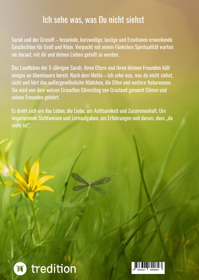 | Schlagworte | Abenteuer • Abenteuergeschichten mit Botschaft • Achtsamkeit • Buch für Groß und Klein • ein Mädchen wird von den Elfen gelehrt • Elfenbuch • Eltern-Kindgeschichten Spiritualität • Energien • Erkenntnis durch Geschichten • Fesselnde Geschichten • Freude • Freundschaft • Fühlen • Geschichten mit Botschaft • Geschichten mit Sinn • Geschichten über Freundschaft • Gnome, Zwerge, Schabernack • Hellsichtigkeitsgeschichten • Ich sehe was, was du nicht siehst • Kindergeschichten • kleines Mädchen, Elfen und Erkenntnisse • Leben, Liebe und das, was wichtig ist • Lebensphilosophie • leichte Vorlesegeschichten mit einem Hauch Spiritualität • Leichtigkeit • Liebe • liebenswerte Geschichten • Liebenswertes Buch • liebevoller Umgang mit allen Wesen • Loslassen • lustige Geschichten • Naturwesen • Sarah wird vom Graselfen gelehrt • Seelen und Körper • Spiritualität • spirituelle Kindergeschichten • Spirituelles Kinderbuch • spirituelles Vorlesebuch für Groß und Klein • spirituelles Vorlesebuch Naturwesen und Hellsichtigkeit • Tiere, Elfen, Achtsamkeit, Abenteuer • Vorlesebuch • Vorlesebuch Vorschule • wundervolle Geschichten • zauberhafte Geschichten mit Herz |