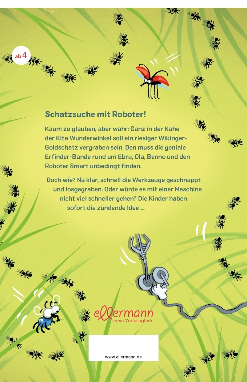 Aufregung in der Kita Wunderwinkel: Im Meer wurde verschollen geglaubtes Wikinger-Gold gefunden, und noch ein zweiter Schatz soll irgendwo an Land vergraben sein. Die Erfinder-Bande rund um Ola, Ebru, Benno und den genialen Roboter Smart ist fest entschlossen, den Schatz zu finden. Bei ihrer Suche kommt Unglaubliches ans Licht: Ausgerechnet der verschrobene Hausmeister, Herr Knallinger, der Nachfahre eines Wikingers. Bedeutet das etwa, dass der Goldschatz in seinem Garten vergraben ist? Die Kinder haben sofort die zündende Idee: Sie bauen ein Gruben-Grab-Gerät, das sie beim Buddeln unterstützt - und schon bald entdecken sie ein Funkeln in der Tiefe des Erdreichs.