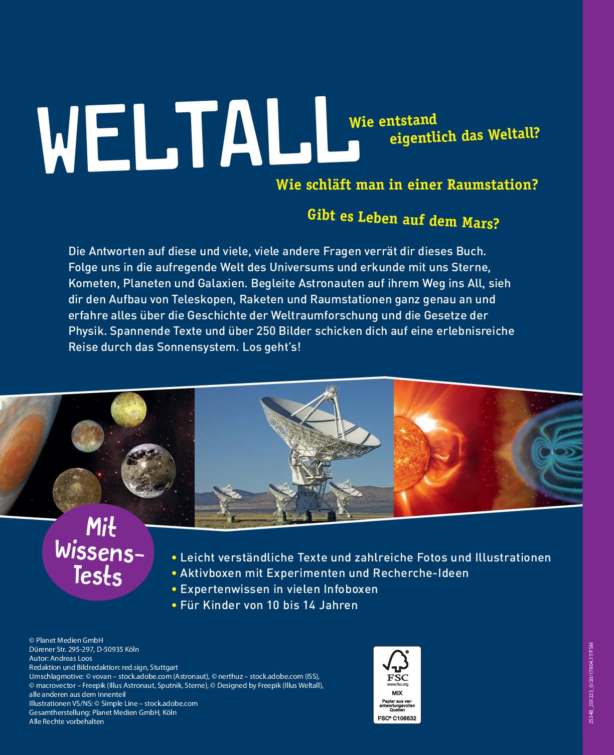 Die Antworten auf diese und viele, viele andere Fragen verrät dir dieses Buch. Folge uns in die aufregende Welt des Universums und erkunde mit uns Sterne, Kometen, Planeten und Galaxien. Begleite Astronauten auf ihrem Weg ins All, sieh dir den Aufbau von Teleskopen, Raketen und Raumstationen ganz genau an und erfahre alles über die Geschichte der Weltraumforschung und die Gesetze der Physik. Spannende Texte und über 250 Bilder schicken dich auf eine erlebnisreiche Reise durch das Sonnensystem. Los geht s!