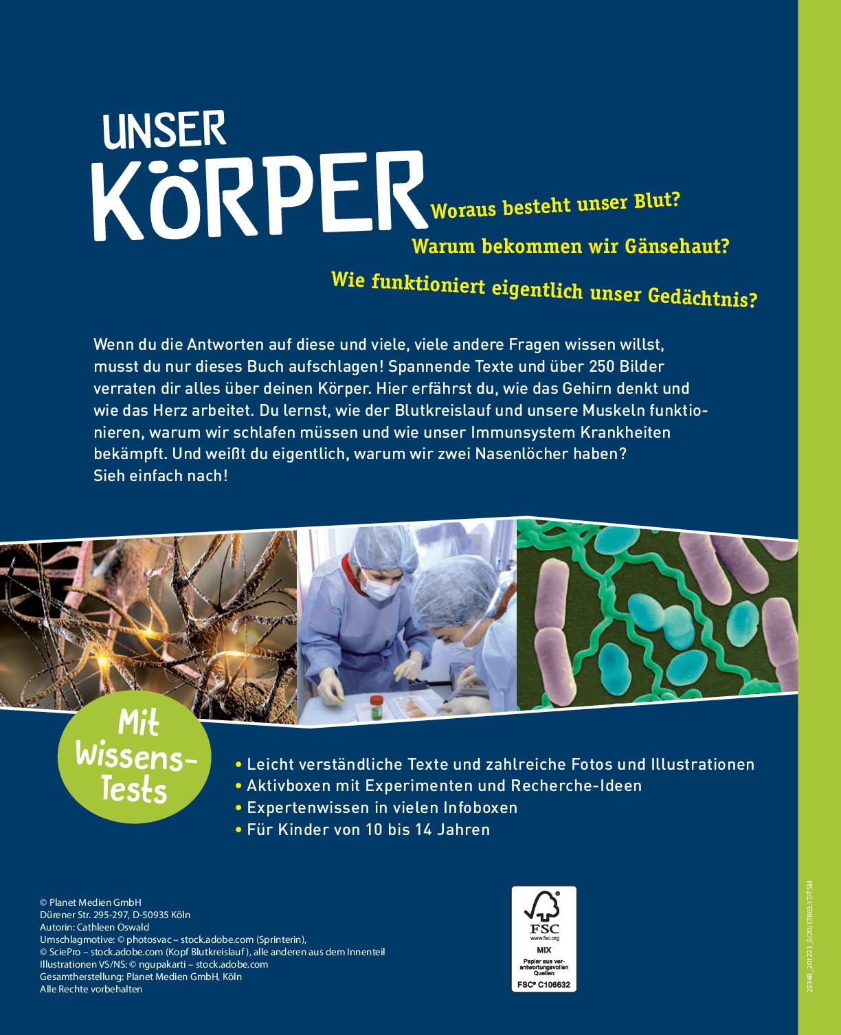 Wenn du die Antworten auf diese und viele, viele andere Fragen wissen willst, musst du nur dieses Buch aufschlagen! Spannende Texte und über 250 Bilder verraten dir alles über deinen Körper. Hier erfährst du, wie das Gehirn denkt und wie das Herz arbeitet. Du lernst, wie der Blutkreislauf und unsere Muskeln funktionieren, warum wir schlafen müssen und wie unser Immunsystem Krankheiten bekämpft. Und weißt du eigentlich, warum wir zwei Nasenlöcher haben?