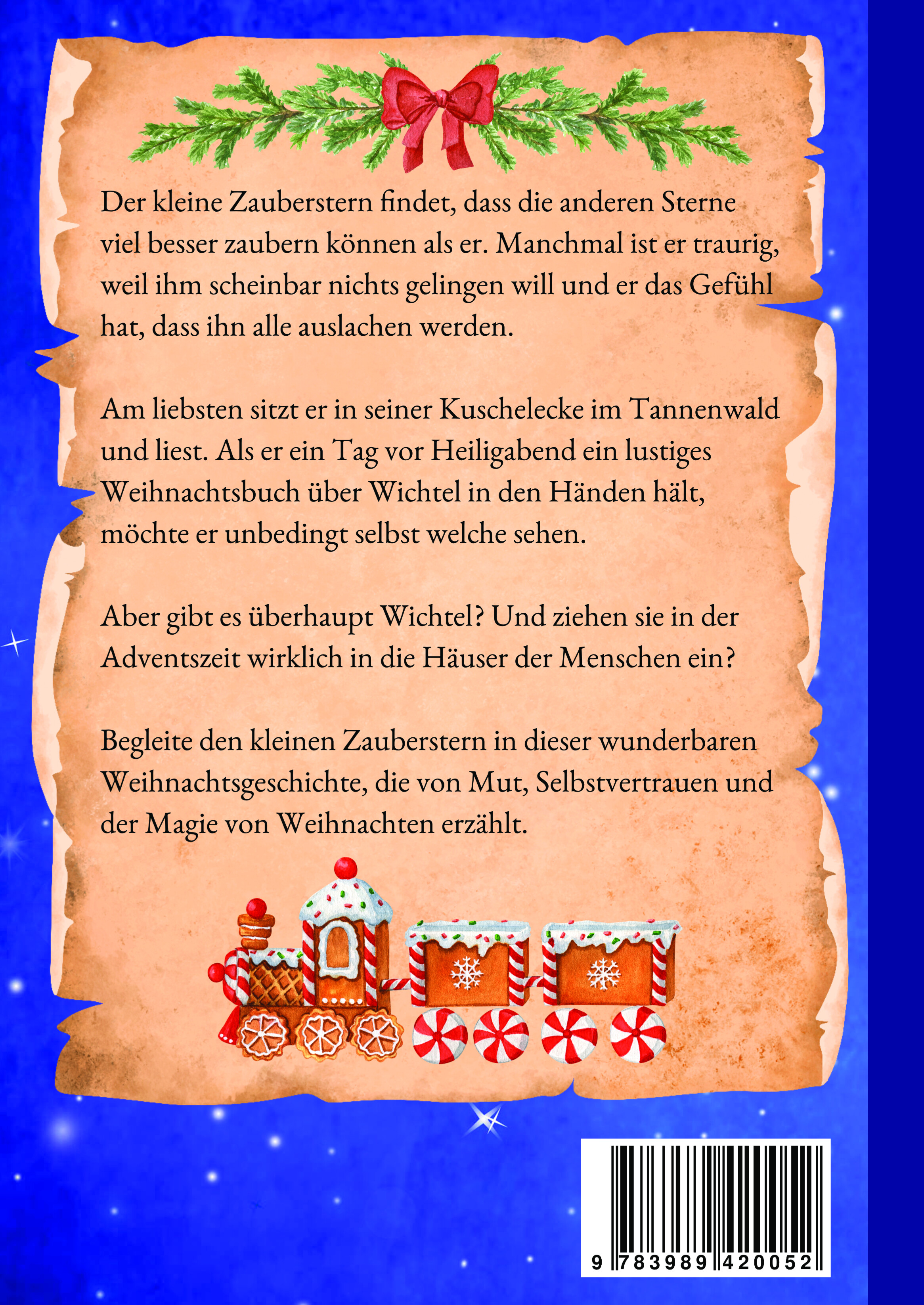 Der kleine Zauberstern findet, dass die anderen Sterne viel besser zaubern können als er. Manchmal ist er traurig, weil ihm scheinbar nichts gelingen will und er das Gefühl hat, dass ihn alle auslachen werden. Am liebsten sitzt er in seiner Kuschelecke im Tannenwald und liest. Als er ein Tag vor Heiligabend ein lustiges Weihnachtsbuch über Wichtel in den Händen hält, möchte er unbedingt selbst welche sehen.