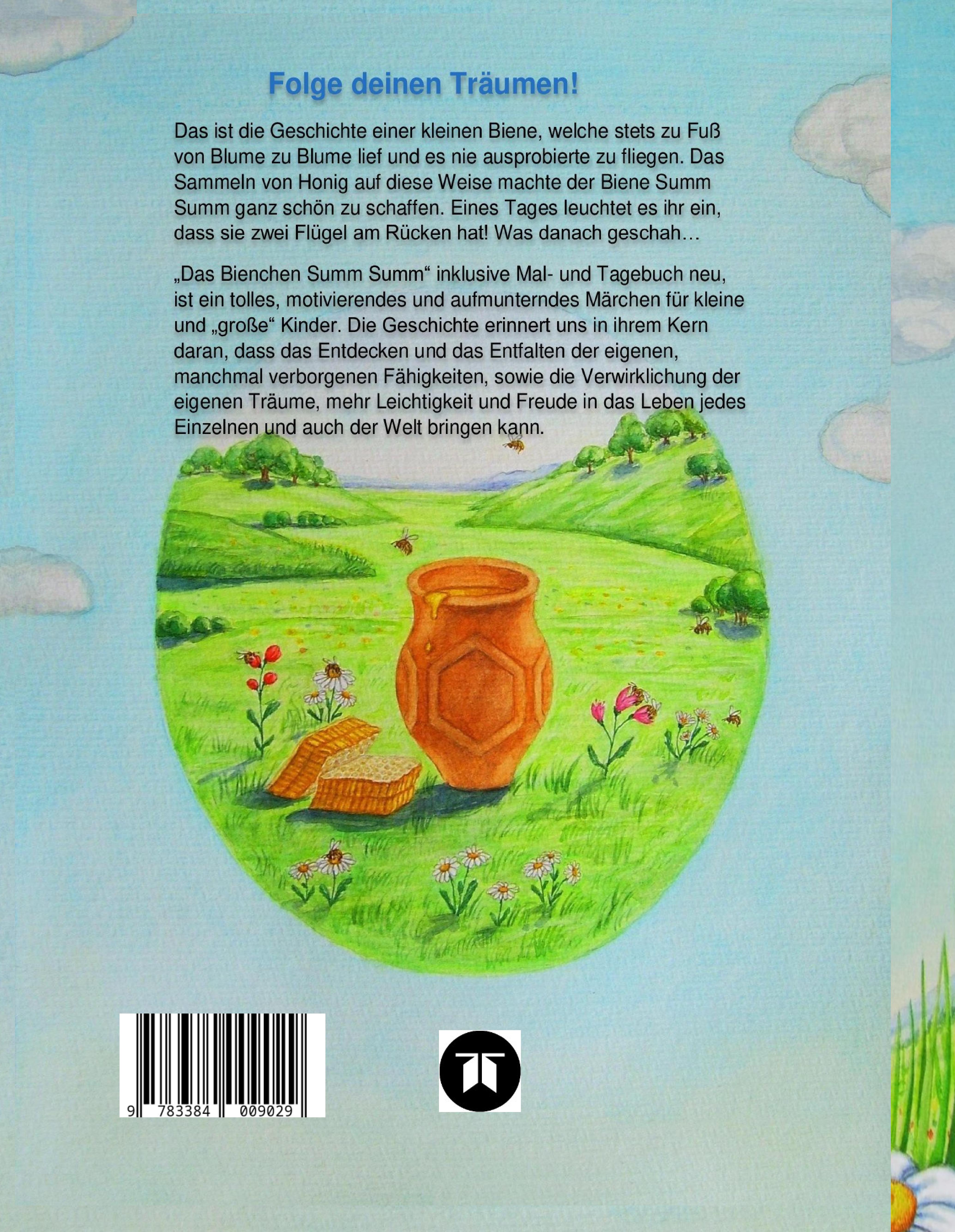 Das ist die Geschichte einer kleinen Biene, welche stets zu Fuß von Blume zu Blume lief und es nie ausprobierte zu fliegen. Das Sammeln von Honig auf diese Weise machte der Biene Summ Summ ganz schön zu schaffen. Eines Tages leuchtet es ihr ein, dass sie zwei Flügel am Rücken hat! Was danach geschah...In das Kinderbuch "Das Bienchen Summ Summ" ist ein Mal-und Tagebuch integriert, mit verschiedenen Aufgaben und Anregungen darin, die den Fokus der Kinder auf die Dinger lenkt, die sie besonders gerne mögen oder machen wollen. Zwischen den spielerischen Fragen wie: "Was ist dein Lieblingstier oder deine Lieblingsblume", sind auch solche Fragen vorhanden, die die Kinder zum tiefer in sich hineinschauen und Nachdenken bringen können, wie: "Was möchtest du mal werden?" oder "Am glücklichsten bist du wenn...""Das Bienchen Summ Summ" inklusive Mal-und Tagebuch, ist ein tolles, motivierendes und aufmunterndes Märchen für kleine und "große" Kinder. Die Geschichte erinnert uns in ihrem Kern daran, dass das Entdecken und das Entfalten der eigenen, manchmal verborgenen Fähigkeiten, sowie die Verwirklichung der eigenen Träume, mehr Leichtigkeit und Freude in das Leben jedes Einzelnen und auch der Welt bringen kann.