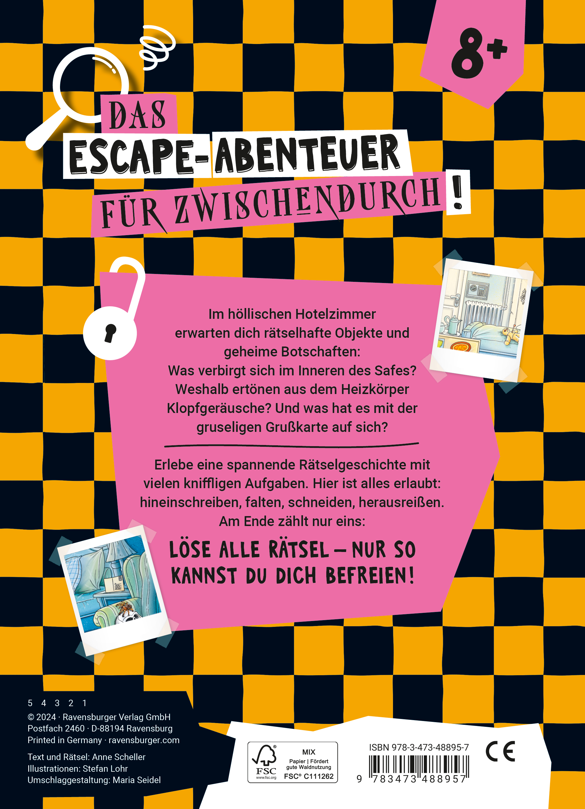 Um sich aus dem Höllischen Hotelzimmer zu befreien, müssen schlaue Köpfe ab 8 Jahren Knobelaufgaben lösen und den Hinweisen im Raum folgen. Dabei ist alles erlaubt: kritzeln, schneiden, falten und zerreißen. Die altersgerechten Aufgaben sind ein toller Einstieg in die Escape Room-Welt, vorausgesetzt das Kind kann schon lesen. Durch das handliche Format können die Rätselfüchse überall und jederzeit tüfteln, knobeln und eine witzige Geschichte erleben - DAS Escape-Abenteuer für zwischendurch!