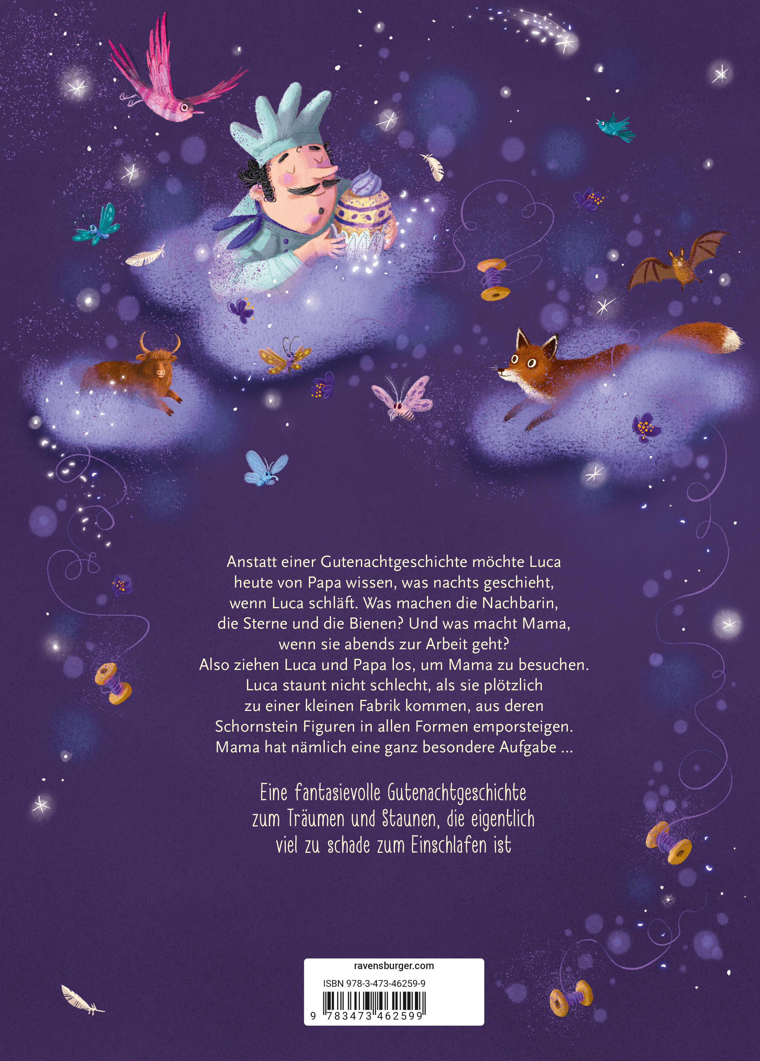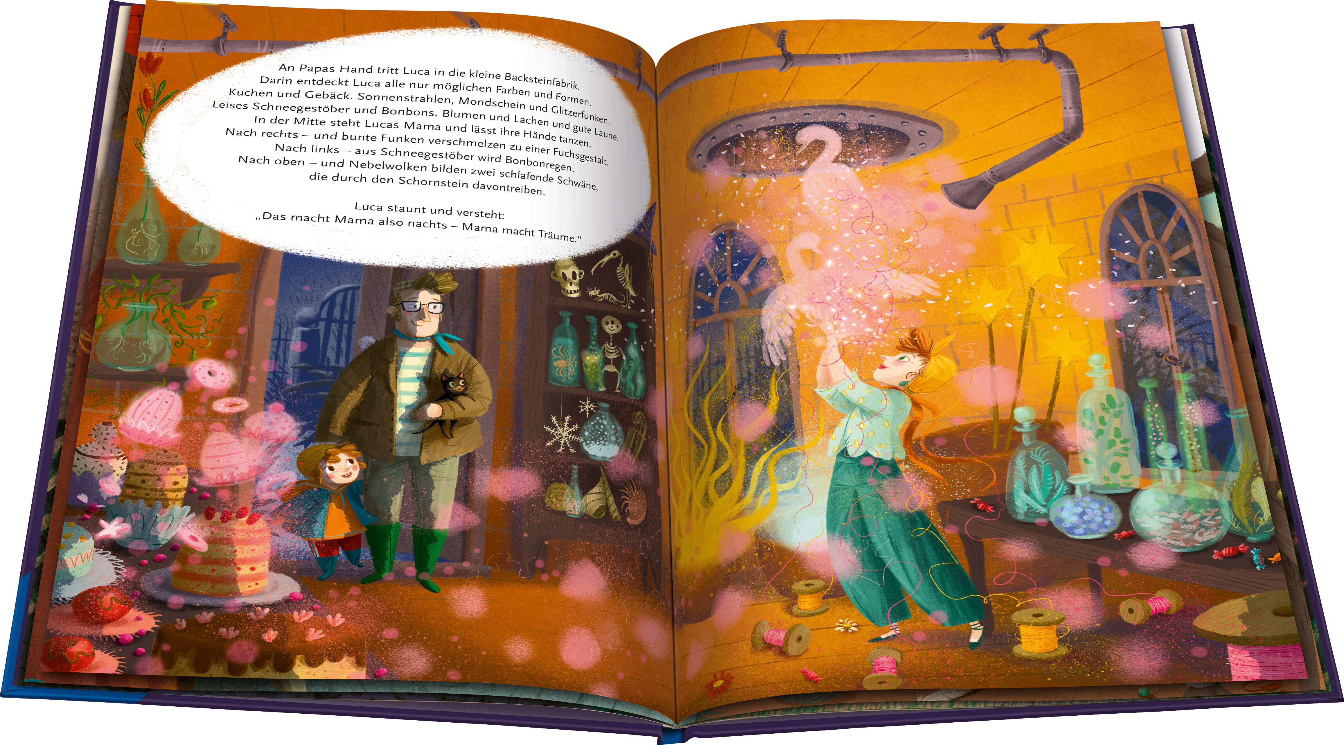 Schließlich kommen sie zu einer kleinen Fabrik, in der sie alle möglichen Tiere sehen, außerdem Farben, Sonnenstrahlen, Glitzerfunken und Bonbons. Luca staunt: Hier also arbeitet Mama. Was sie wohl macht? Die Antwort lässt Luca ganz schön staunen ...
