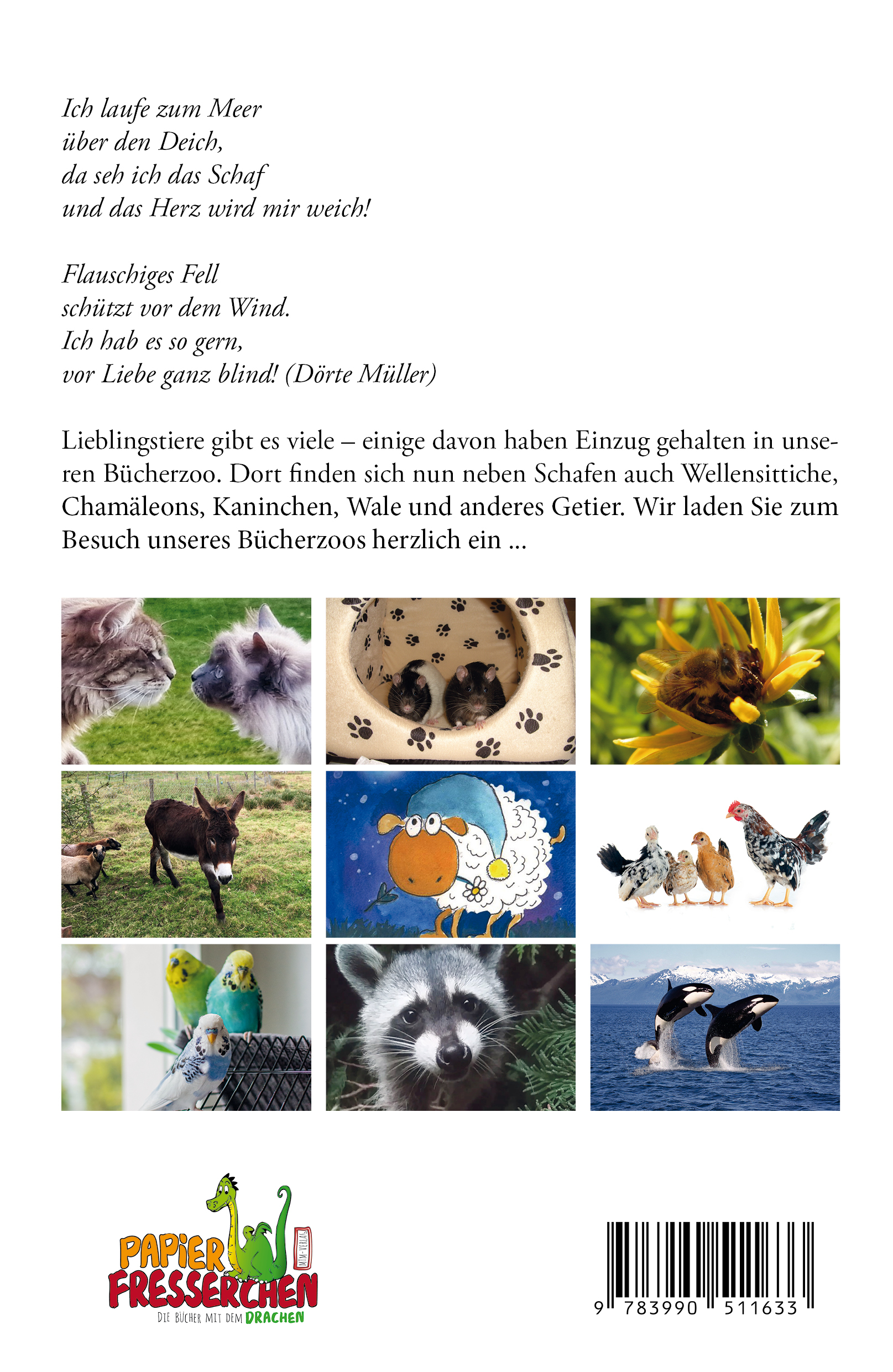 Ich laufe zum Meerüber den Deich,da seh ich das Schafund das Herz wird mir weich!Flauschiges Fellschützt vor dem Wind.Ich hab es so gern,vor Liebe ganz blind! (Dörte Müller)Lieblingstiere gibt es viele - einige davon haben Einzug gehalten in unseren Bücherzoo. Dort finden sich nun neben Schafen auch Wellensittiche, Chamäleons, Kaninchen, Wale und anderes Getier. Wir laden Sie zum Besuch unseres Bücherzoos herzlich ein ...