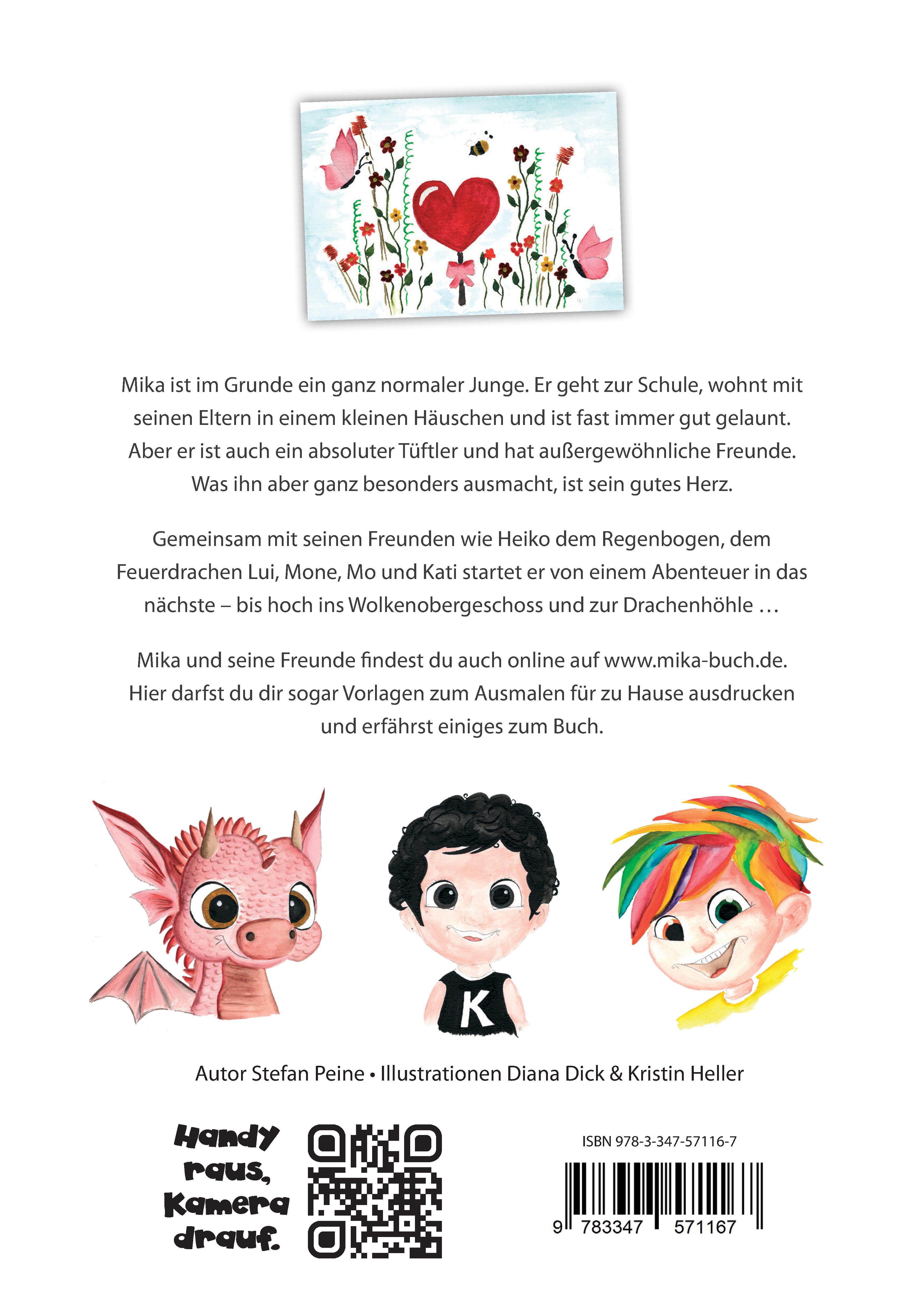Mika ist im Grunde ein ganz normaler Junge. Er geht zur Schule, wohnt mit seinen Eltern in einem kleinen Häuschen und ist fast immer gut gelaunt. Aber er ist auch ein absoluter Tüftler und hat außergewöhnliche Freunde. Was ihn aber ganz besonders ausmacht, ist sein gutes Herz.Gemeinsam mit seinen Freunden wie Heiko dem Regenbogen, dem Feuerdrachen Lui, Mone, Mo und Kati startet er von einem Abenteuer in das nächste - bis hoch ins Wolkenobergeschoss und zur Drachenhöhle ...Mika und seine Freunde findest du auch online auf www.mika-buch.de. Hier darfst du dir sogar Vorlagen zum Ausmalen für zu Hause ausdrucken und erfährst einiges zum Buch.