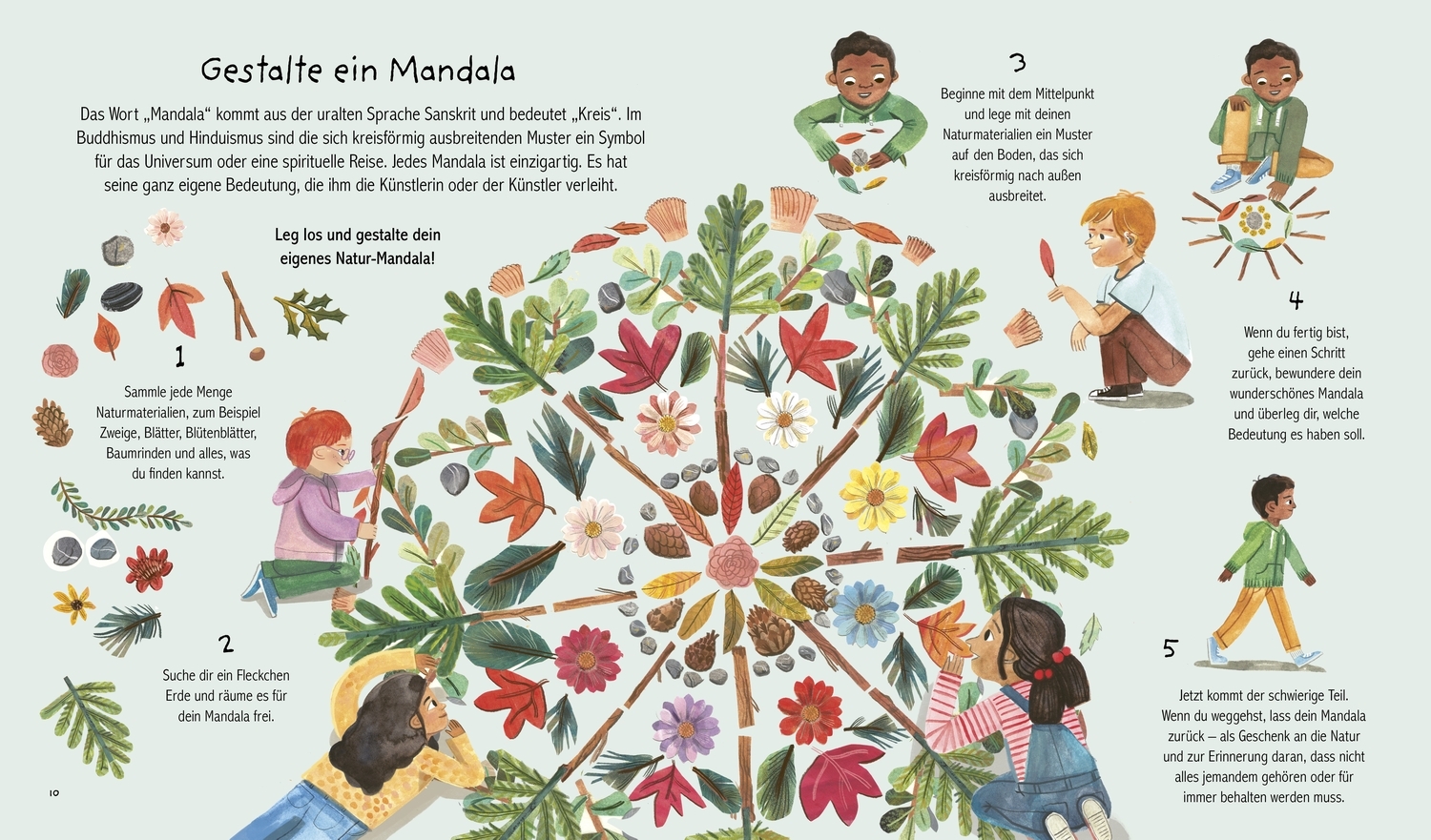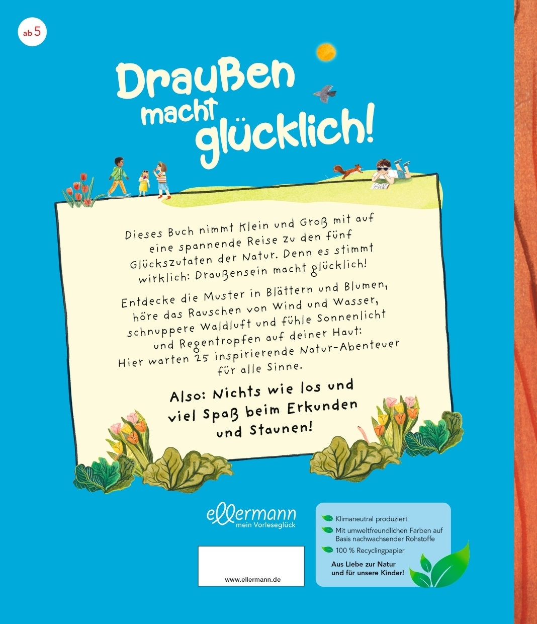 Draußen sein macht glücklich! Zeit im Grünen und an der frischen Luft ist wunderbar heilsam und hilft, Stress abzubauen und zur Ruhe zu kommen. Dieses Buch nimmt Klein und Groß mit auf eine Reise durch die fünf Glückszutaten der Natur und steckt voller Inspirationen zum achtsamen Draußensein. Von der Beobachtung der Muster von Wurzeln und Blättern über besondere Natur-Geräusche bis hin zur Kraft des Sonnenlichts und des Regens: Hier entdecken kleine und große Leser*innen, wie sie mit allen Sinnen wahrnehmen, spüren und schätzen können, was die Natur für sie, ihren Geist und ihren Körper tut. Also: Nichts wie los und raus ins Glück!