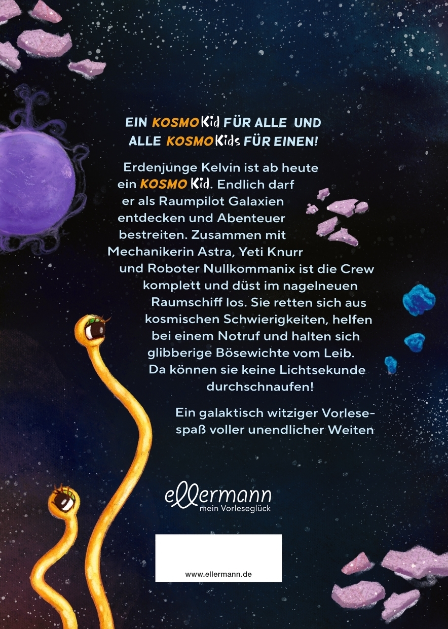 Endlich Astronaut: Kelvin hat es geschafft und ist jetzt ein Kosmo Kid! Im Auftrag der Unendliche Weiten Erforschung darf er nun fremde Galaxien entdecken. Mit seiner galaktisch-guten Crew düst er los: Die Mechanikerin Astra, die alles reparieren kann, was ihr in die Finger kommt und in einem Schwebestuhl sitzt, weil sie nicht laufen kann. Der Yeti-Ritter Knurr, der zwar keine menschliche Sprache spricht, aber stark ist und gut kochen kann. Und das Roboterkind Nullkommanix - das Superhirn der Crew. Ihre aufregenden Abenteuer lassen sie keine Lichtsekunde durchschnaufen! Sie helfen bei einem galaktischen Notruf, retten kuschlige Alienhunde und halten sich glibberige Bösewichte vom Leib. Dieses rasante Science Fiction Vorlesebuch für Vorschulkinder ab 5 Jahren macht einfach nur Spaß. Ein wunderbares Abenteuer im Weltraum mit genialen Illustrationen und viel Witz - auch für nerdige Erwachsene!