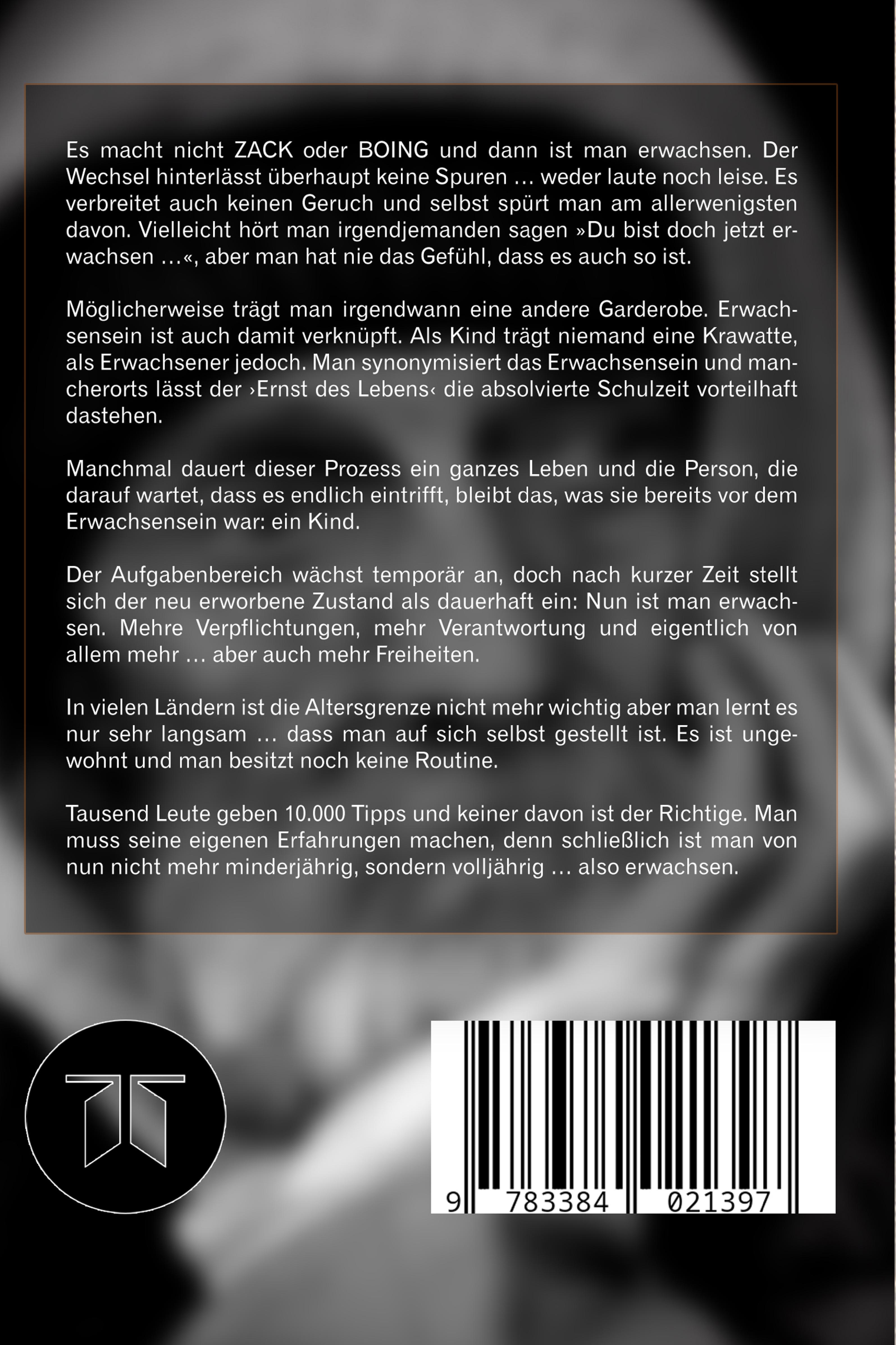 Es macht nicht ZACK oder BOING und dann ist man erwachsen. Der Wechsel hinterlässt überhaupt keine Spuren ... weder laute noch leise. Es verbreitet auch keinen Geruch und selbst spürt man am allerwenigsten davon. Vielleicht hört man irgendjemanden sagen »Du bist doch jetzt erwachsen ...«, aber man hat nie das Gefühl, dass es auch so ist.Möglicherweise trägt man irgendwann eine andere Garderobe. Erwachsensein ist auch damit verknüpft. Als Kind trägt niemand eine Krawatte als Erwachsener jedoch. Man synonymisiert das Erwachsensein und mancherorts lässt der 'Ernst des Lebens' die absolvierte Schulzeit vorteilhaft dastehen.Manchmal dauert dieser Prozess ein ganzes Leben und die Person, die darauf wartet, dass es endlich eintrifft, bleibt das, was sie bereits vor dem Erwachsensein war: ein Kind.Der Aufgabenbereich wächst temporär an, doch nach kurzer Zeit stellt sich der neu erworbene Zustand als dauerhaft ein: Nun ist man erwachsen. Mehre Verpflichtungen, mehr Verantwortung und eigentlich von allem mehr ... aber auch mehr Freiheiten.In vielen Ländern ist die Altersgrenze nicht mehr wichtig aber man lernt es nur sehr langsam ... dass man auf sich selbst gestellt ist. Es ist ungewohnt und man besitzt noch keine Routine.Tausend Leute geben 10.000 Tipps und keiner davon ist der Richtige. Man muss seine eigenen Erfahrungen machen, denn schließlich ist man von nun nicht mehr minderjährig, sondern volljährig ... also erwachsen.Und dann bist du endlich 18 Jahre alt oder 18 Jahre jung ... jedenfalls erwachsen. Du bist kein Kind mehr, kein Jugendlicher mehr und ... was bist du nun? Du trägst keine kurzen Hosen mehr und hast noch immer keine Vorstellung von dem, was auf dich zukommt. Dein Zuhause ist deine Bastion, dein Ankerplatz und der Dreh- und Angelpunkt deines bisherigen Lebens.Aber all das ist dir schon lange vertraut, es kommt nichts Weiteres mehr auf dich zu als das, womit du es seit deiner Geburt zu tun hast ... mit dir selbst und deinem Leben ... bloß wird es an einem anderen Ort weitergeführt. Es ist deine Entscheidung, deine Freiheit und dein persönliches Abenteuer namens Erwachsensein.Vielleicht wird sich dein Leben verändern, vielleicht aber auch nicht. Eventuell wird es sofort passieren, eventuell aber auch erst später. Möglicherweise warst du schon lange vorher erwachsen, möglicherweise wirst du es aber erst mit 70 Jahren sein ... möglicherweise sogar nie.